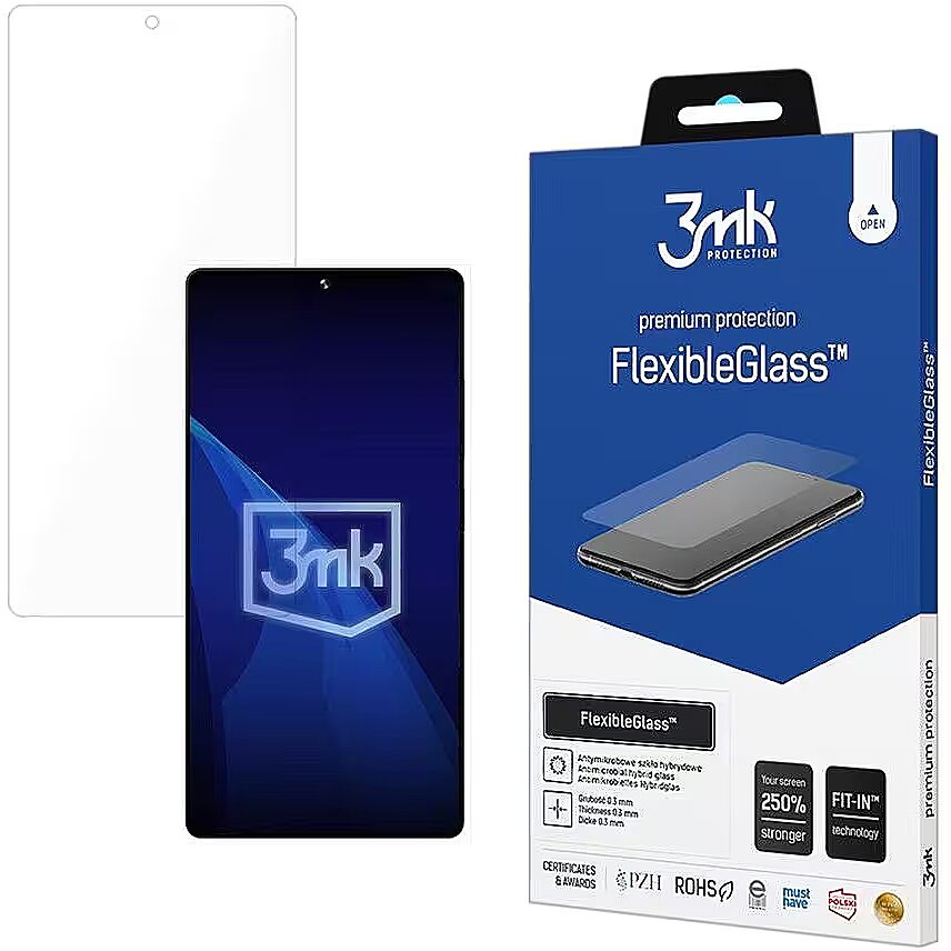 Description - FlexibleGlass A non-cracking hybrid combining the best features of film and glass. Almost invisible 0.3 mm thick increases the feeling of no additional layer on the screen 100% precision and sensitivity to touch FlexibleGlass provides the impression of using the glass screen caused by smooth slide Impact-proof FlexibleGlass amplifies the screen up to 250% absorbing impact energy. Thanks to its flexible structure, the glass can be bent and at the same time is safe for the hand. Perfect fit to the screen and edge finish FlexibleGlass has all holes for the speaker, sensors, camera and button, if present on the smartphone. Dscouts research showed that the average user holds the phone in his hand for almost 2.5 hours a day. FlexibleGlass is approved by the National Institute of Hygiene, which guarantees that it is free of harmful substances and safe for your health no matter how much time you spend on the phone. While were protecting the phones, were concerned about the planet. FlexibleGlass has successfully passed RoHS certification in an independent laboratory this means that it is environmentally friendly and complies with strict EU directives on heavy metals and hazardous substances (including lead, mercury and cadmium). Easy and quick installation without bubbles Thanks to the Fit-In positioning stickers, you can precisely you will match the glass to the screen. Comfort of use Fingerprints make it uncomfortable to use the phone. The olephobic layer used in the hybrid glass minimizes the formation of dirt, facilitates cleaning of the screen and provides an additional protective shield. Very high scratch protection - 7H Such a high hardness, exceeding the protective films, was achieved by enriching the structure with an additional ceramic coating. Set contains: 1 pc. FlexibleGlass (front) Dust­-Fix strips Fit-In positioning strips Anti-­Bubble Card CleaningSet