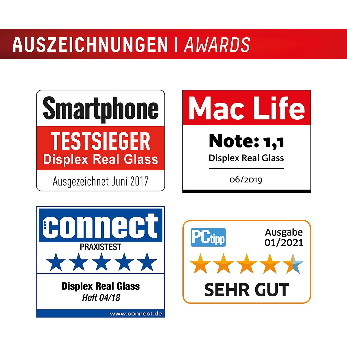 LongDesc - Real Glass (2D) with Case, 360°-Protection with EASY-ON® Eco Mounting Frame Protective case for 360°-protectionOur Displex protective glass is manufactured to within 5/100 mm of the smartphone contours and therefore fits perfectly on your smartphone. In addition, the protective film is ultra-thin at 3mm. This means that the transparent case, that is included in this product, can be used perfectly with the screen protection glass. But also all other standard-sized protective cases can be used with the screen protector. Thus, your smartphone is optimally protected all around by a combined protection of the Displex Tempered Glass and your favourite case. Tempered glass with rounded edgesAll Displex protective glasses have a surface hardness of 10H and are therefore not only more scratch-, break- and shock-resistant than comparable brand products, but even surpass sapphire glass, which is used in luxury watches and has a hardness of 9H.Even the edges, the area of the smartphone and protective glass most susceptible to breakage and impact, are specially hardened, rounded by 4-fold polishing and finished with a shock-absorbing edge. This elaborate production process further increases the protection against knocks and bumps and allows a particularly pleasant use of the smartphone. With these features, the protective glass is extremely resistant and guarantees maximum breakage resistance. Case-friendlyOur Displex protective glass is manufactured to within 5/100 mm of the smartphone contours and therefore fits perfectly on your smartphone. In addition, the protective film is ultra-thin at 0,3mm. This means that all standard-sized protective cases can be used with the screen protection glass. Thus, your smartphone is optimally protected all around by a combined protection of the Displex Tempered Glass and your favourite case. Anti fingerprint coatingThe top layer of our 4-Layer Technology is a high-tech plasma coating. With an extremely long-lasting effect, this coating effectively repels fingerprints. In addition, the plasma coating guarantees a soft scrolling experience. This technology not only makes your display look better, but it also keeps it cleaner and therefore requires less frequent cleaning. High-tech splinter protectionThe high-tech shatter protection integrated in the Real Glass from Displex guarantees absolute safety even if the protective glass breaks. Thanks to the composite material of the second layer in the protective glass, it does not shatter and thus guarantees absolutely safe use. If the worst should come to the worst and the protective glass has absorbed a blow, fall or impact and is broken, the Displex protective glass can be easily pulled off the display in one piece thanks to the integrated high-tech shatter protection. High-performance adhesiveOnce the protective glass has been fitted, the high-performance adhesive ensures optimum adhesion properties and a clear look. The adhesive is adapted to all display coatings of the various manufacturers so that the protective film for mobile phones holds reliably in the long term. The visual appearance is not affected either: despite the screen protection film, you can enjoy gripping videos and photos with maximum transparency and colour fidelity. Simple & bubble-free applicationWith the EASY-ON® Eco Mounting Frame and the accompanying video tutorials, mounting the tempered glass is incredibly quick, easy and precise. In addition the EASY-ON® Eco Mounting Frame is made of premium solid cardboard and is therefore not only sustainable, but also a 100% recyclable. The result is worth seeing: no crooked positioning of the screen protector on the display, no concealed openings for speakers or microphones and certainly no bubbles under the protective glass.