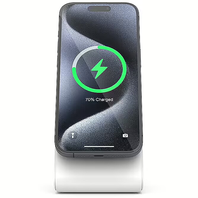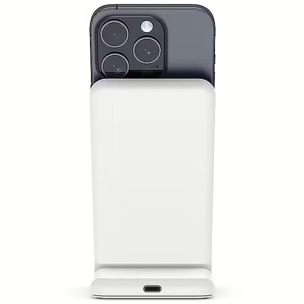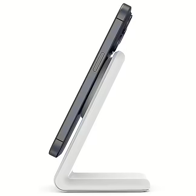 Description - The MagSpot Stand charger is a must-have gadget for every user of iPhone with MagSafe and headphones with wireless charging function. The minimalist design allows you to conveniently charge your phone or Apple AirPods in the charging case. It takes up very little space, so it can fit even on a small desk or bedside table. The elevated MagSafe ring ensures compatibility with all iPhone models regardless of camera size. The phone can be additionally charged both in portrait mode and in standby mode (available in iOS 17). The set includes a USB-C cable in the color of the charger. Compatible with MagSafe (iPhone 12 and newer) Wirelessly charging AirPods (with charging case) Output Power: iPhone (Max 15W), AirPods (Max 5W) Elevated MagSafe ring Charging your phone in standby mode Possibility to charge Android smartphones with a MagSafe magnetic plate Rubber base with anti-slip properties USB-C cable included (in the color of the charger) Required USB-C mains charger min. 20W