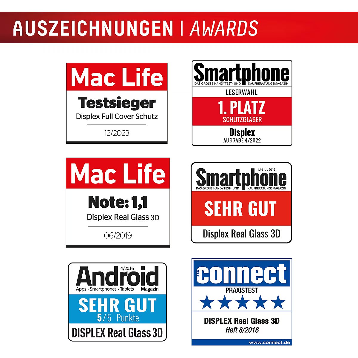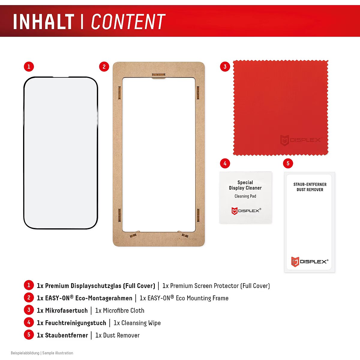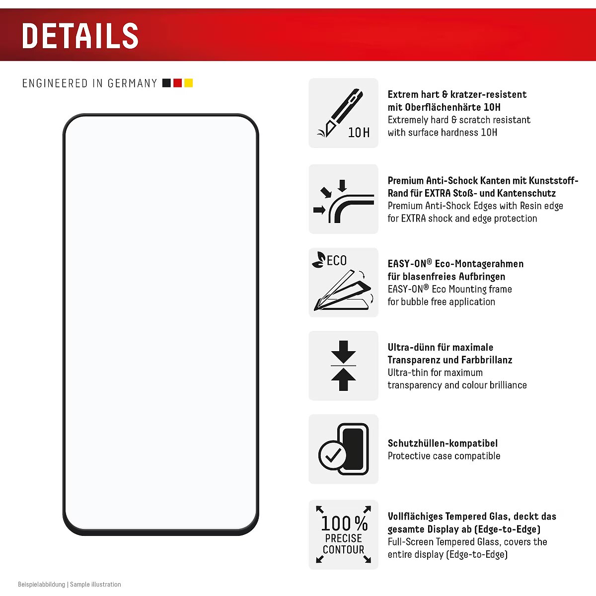 LongDesc - Full Cover or 3D/ Curved Real Glass with EASY-ON® Eco Mounting Frame Full screen coverageCompared to the so-called 2D protective glasses, Displex Full Cover protective glasses cover not only the active display area, but the entire display area. This means optimum protection of the entire display and an improved user experience: maximum protection without annoying edges.This feature is particularly advantageous for smartphones with rounded displays. Since the screen protector adapts perfectly to the rounded display and thus protects the entire display area. Tempered glass with rounded edgesAll Displex protective glasses have a surface hardness of 10H and are therefore not only more scratch-, break- and shock-resistant than comparable brand products, but even surpass sapphire glass, which is used in luxury watches and has a hardness of 9H.Even the edges, the area of the smartphone and protective glass most susceptible to breakage and impact, are specially hardened, rounded by 4-fold polishing and finished with a shock-absorbing edge. This elaborate production process further increases the protection against knocks and bumps and allows a particularly pleasant use of the smartphone. With these features, the protective glass is extremely resistant and guarantees maximum breakage resistance. Case-friendlyOur Displex protective glass is manufactured to within 5/100 mm of the smartphone contours and therefore fits perfectly on your smartphone. In addition, the protective film is ultra-thin at 0,3mm. This means that all standard-sized protective cases can be used with the screen protection glass. Thus, your smartphone is optimally protected all around by a combined protection of the Displex Tempered Glass and your favourite case. Anti fingerprint coatingThe top layer of our 4-Layer Technology is a high-tech plasma coating. With an extremely long-lasting effect, this coating effectively repels fingerprints. In addition, the plasma coating guarantees a soft scrolling experience. This technology not only makes your display look better, but it also keeps it cleaner and therefore requires less frequent cleaning. High-tech splinter protectionThe high-tech shatter protection integrated in the Real Glass from Displex guarantees absolute safety even if the protective glass breaks. Thanks to the composite material of the second layer in the protective glass, it does not shatter and thus guarantees absolutely safe use. If the worst should come to the worst and the protective glass has absorbed a blow, fall or impact and is broken, the Displex protective glass can be easily pulled off the display in one piece thanks to the integrated high-tech shatter protection. High-performance adhesiveOnce the protective glass has been fitted, the high-performance adhesive ensures optimum adhesion properties and a clear look. The adhesive is adapted to all display coatings of the various manufacturers so that the protective film for mobile phones holds reliably in the long term. The visual appearance is not affected either: despite the screen protection film, you can enjoy gripping videos and photos with maximum transparency and colour fidelity. Simple & bubble-free applicationWith the EASY-ON® Eco Mounting Frame and the accompanying video tutorials, mounting the tempered glass is incredibly quick, easy and precise. In addition the EASY-ON® Eco Mounting Frame is made of premium solid cardboard and is therefore not only sustainable, but also a 100% recyclable. The result is worth seeing: no crooked positioning of the screen protector on the display, no concealed openings for speakers or microphones and certainly no bubbles under the protective glass.