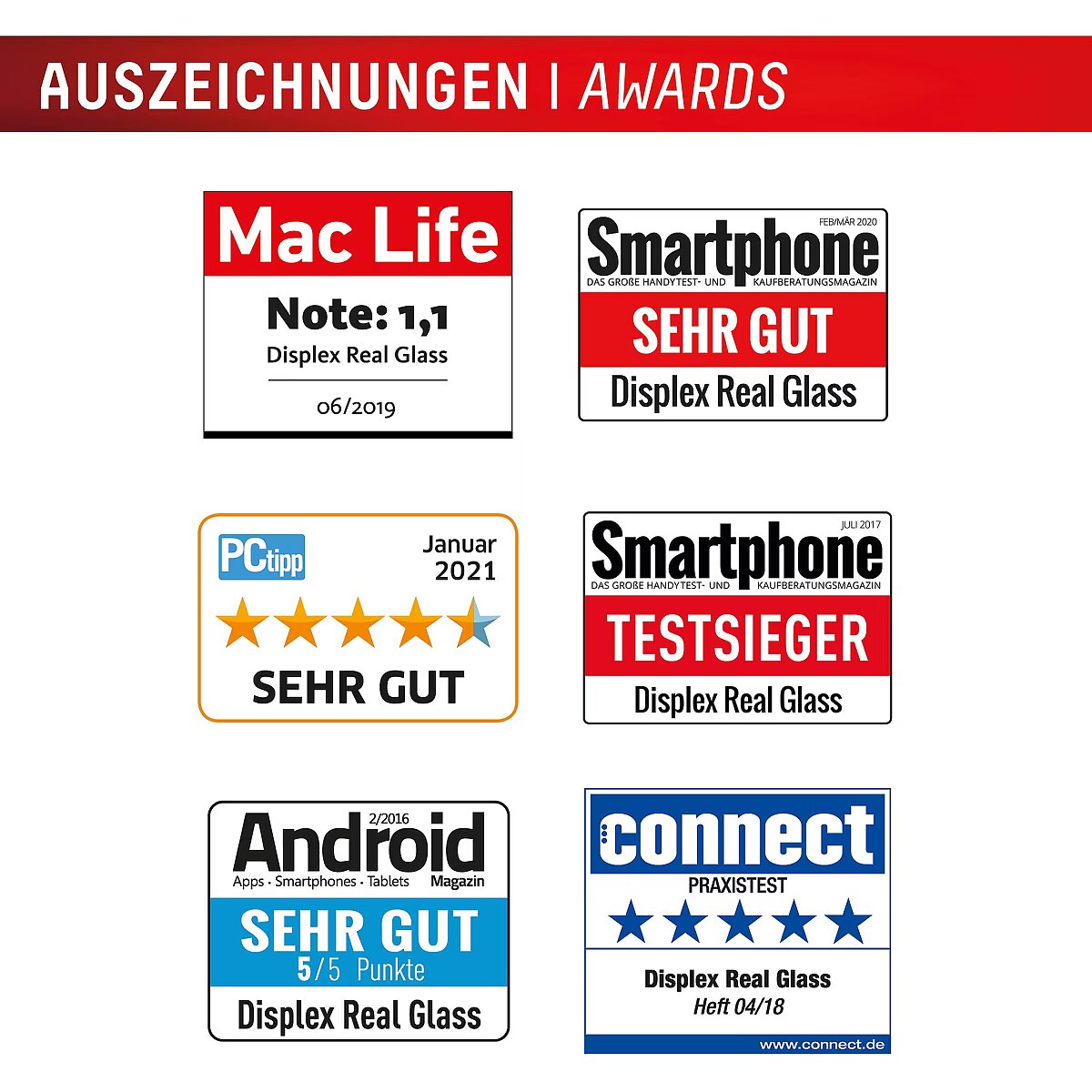 LongDesc - Real Glass (2D) with EASY-ON® Eco Mounting Frame Tempered glass with rounded edgesAll Displex protective glasses have a surface hardness of 10H and are therefore not only more scratch-, break- and shock-resistant than comparable brand products, but even surpass sapphire glass, which is used in luxury watches and has a hardness of 9H.Even the edges, the area of the smartphone and protective glass most susceptible to breakage and impact, are specially hardened, rounded by 4-fold polishing and finished with a shock-absorbing edge. This elaborate production process further increases the protection against knocks and bumps and allows a particularly pleasant use of the smartphone. With these features, the protective glass is extremely resistant and guarantees maximum breakage resistance. Case-friendlyOur Displex protective glass is manufactured to within 5/100 mm of the smartphone contours and therefore fits perfectly on your smartphone. In addition, the protective film is ultra-thin at 0,3mm. This means that all standard-sized protective cases can be used with the screen protection glass. Thus, your smartphone is optimally protected all around by a combined protection of the Displex Tempered Glass and your favourite case. Anti fingerprint coatingThe top layer of our 4-Layer Technology is a high-tech plasma coating. With an extremely long-lasting effect, this coating effectively repels fingerprints. In addition, the plasma coating guarantees a soft scrolling experience. This technology not only makes your display look better, but it also keeps it cleaner and therefore requires less frequent cleaning. High-tech splinter protectionThe high-tech shatter protection integrated in the Real Glass from Displex guarantees absolute safety even if the protective glass breaks. Thanks to the composite material of the second layer in the protective glass, it does not shatter and thus guarantees absolutely safe use. If the worst should come to the worst and the protective glass has absorbed a blow, fall or impact and is broken, the Displex protective glass can be easily pulled off the display in one piece thanks to the integrated high-tech shatter protection. High-performance adhesiveOnce the protective glass has been fitted, the high-performance adhesive ensures optimum adhesion properties and a clear look. The adhesive is adapted to all display coatings of the various manufacturers so that the protective film for mobile phones holds reliably in the long term. The visual appearance is not affected either: despite the screen protection film, you can enjoy gripping videos and photos with maximum transparency and colour fidelity. Simple & bubble-free applicationWith the EASY-ON® Eco Mounting Frame and the accompanying video tutorials, mounting the tempered glass is incredibly quick, easy and precise. In addition the EASY-ON® Eco Mounting Frame is made of premium solid cardboard and is therefore not only sustainable, but also a 100% recyclable. The result is worth seeing: no crooked positioning of the screen protector on the display, no concealed openings for speakers or microphones and certainly no bubbles under the protective glass.