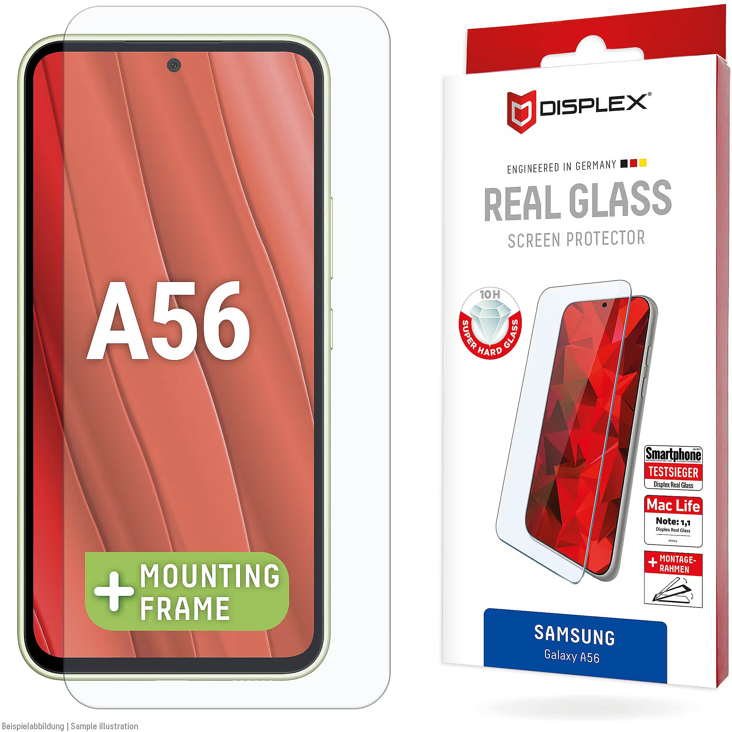 ShortSummaryDescription - Displex Screen Protector (10H) for Samsung Galaxy A56, Eco Mounting Frame, scratch resistant, Samsung, Galaxy A56, Dry application, Dirt resistant, Impact resistant, Scratch resistant, Transparent, 1 pc(s)
