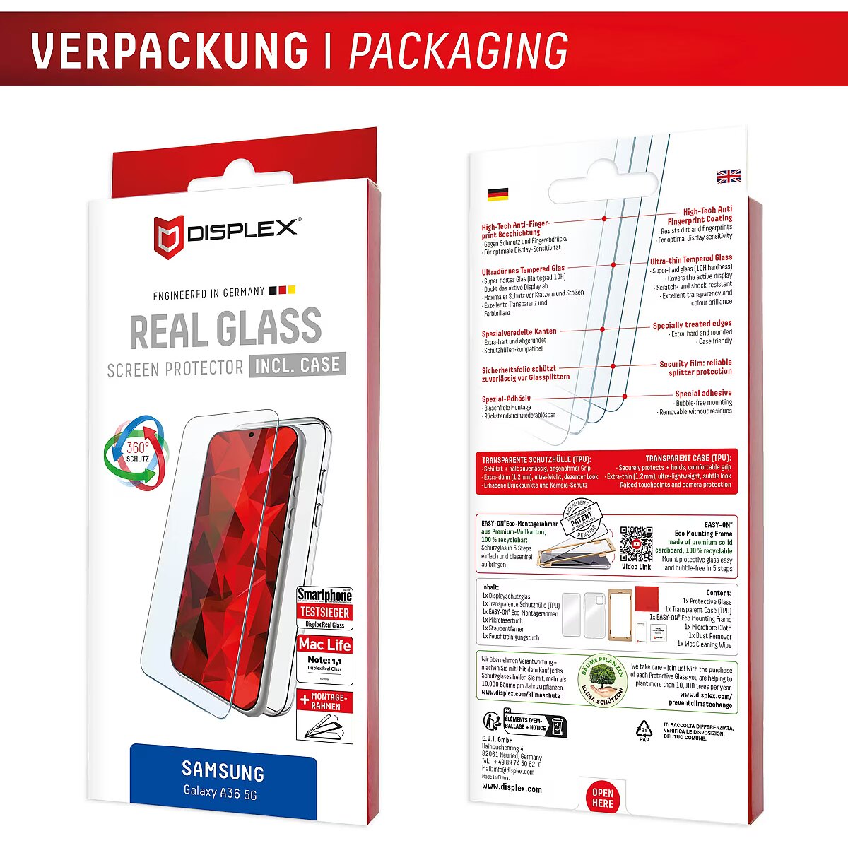LongSummaryDescription - Displex Screen Protector + Case for Samsung Galaxy A36, Eco Mounting Frame, scratch resistant. Brand compatibility: Samsung, Compatibility: Galaxy A36. Dry application. Protection features: Dirt resistant, Dust resistant, Impact resistant, Scratch resistant, Shock resistant. Material: Tempered glass, Product colour: Transparent. Quantity per pack: 1 pc(s)