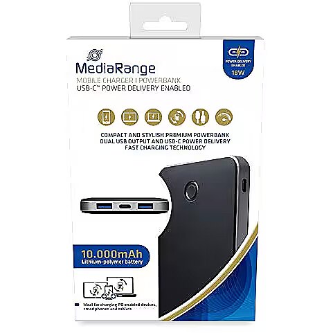 Description - MediaRange Mobile charger I Powerbank 10.000mAh, 2x USB-A and 1x USB-C®, supports USB-C® Power Delivery and Quick Charge™, black/silver MediaRange Powerbanks are your ideal travel companion. Whether for smartphone, tablet or other devices: With our powerful USB Power Banks you have always your reliable power supply.The compact and lightweight batteries are rechargable via the included USB charging cable to the computer or an optional AC adapter to the wall outlet and can be used immediately. Rechargeable Lithium-polymer battery: 10.000mAh I 3.7V I 37Wh USB Type-C® Input: DC 5.0V⎓3.0A or 9.0V⎓2.0A (18.0W max.) Micro USB Input: DC 5.0V⎓2.0A or 9.0V⎓2.0A (18.0W max.) Quick Charge™ 3.0 USB-A1 and USB-A2 output: DC 4.5V ⎓ 5.0A or DC 5.0V ⎓ 3.0A or DC 9.0V ⎓ 2.25A or DC 12.0V ⎓ 1.67A (22.5W max.) USB Type-C® Power Delivery 3.0 output: DC 5.0V ⎓ 3.0A or DC 9.0V ⎓ 2.23A or DC 12.0V ⎓ 1.67A (20W max.) Suitable for simultaneous charging of devices: USB-A1 + USB-A2 + USB Type-C®output: DC 5.0V ⎓ 3.0A (15W max.) LED battery level and charging mode indicator, overvoltage protection, overcharge protection, discharge protection and short circuit fuse Charging cycles: >500 USB Type-C® to USB charging cable included (approx. 30cm)