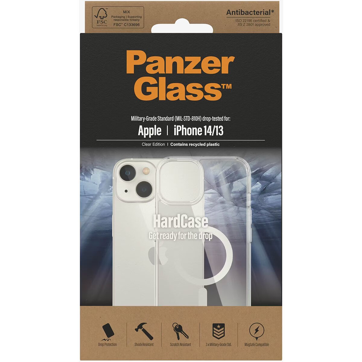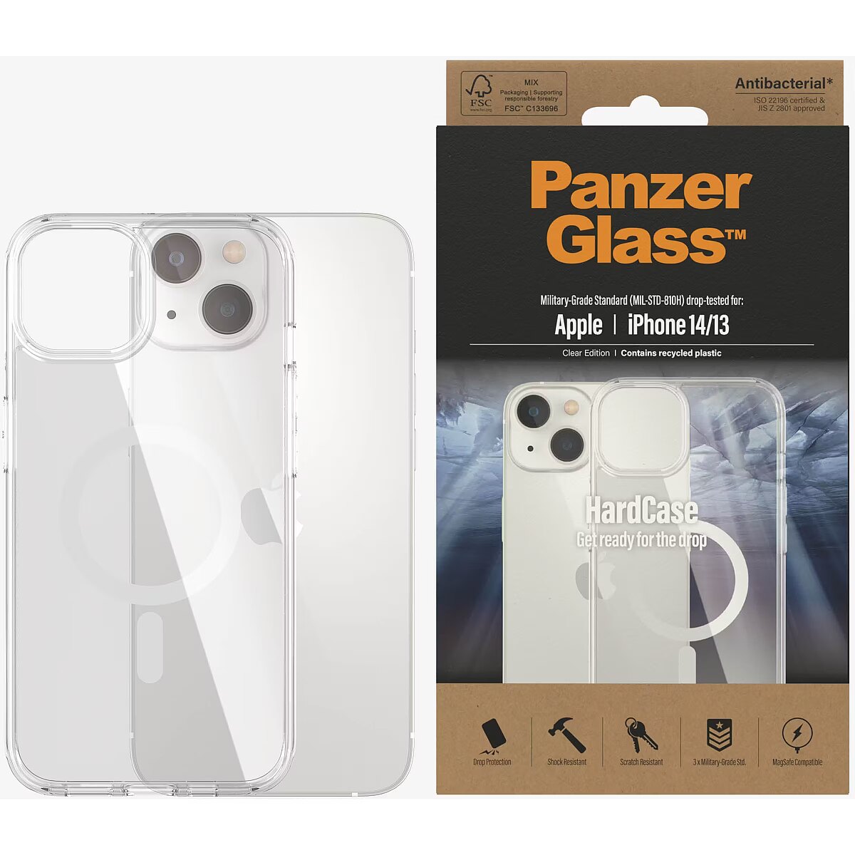 LongDesc - Life is a contact sport. Protect your phone from the bumps and bruises of everyday life with the PanzerGlass™ HardCase. Simply snap it on and you’re ready to go. The HardCase features a stiff, transparent back cover surrounded by a softer frame, and is fully MagSafe compatible. This combination of materials provides a high level of drop protection. The case has been drop-tested according to 3 x Military Grade Standard, which means that it can withstand several drops from a height of 3.6 meters or a sitting-on-a-balcony-and-accidently-dropping-my-device kind of height.And to top it all off, the HardCase is anti-yellowing so it will continue to look good, day after day – even with heavy use. The case also provides an extra level of protection from germs and bacteria thanks to an antibacterial effect that is proven to kill up to 99.99% of the most common surface bacteria.Our products are designed with a commitment to extend the lifetime of your The HardCase frame is made from 100% recycled material and the case comes in FSC-certified packaging that can be recycled.
