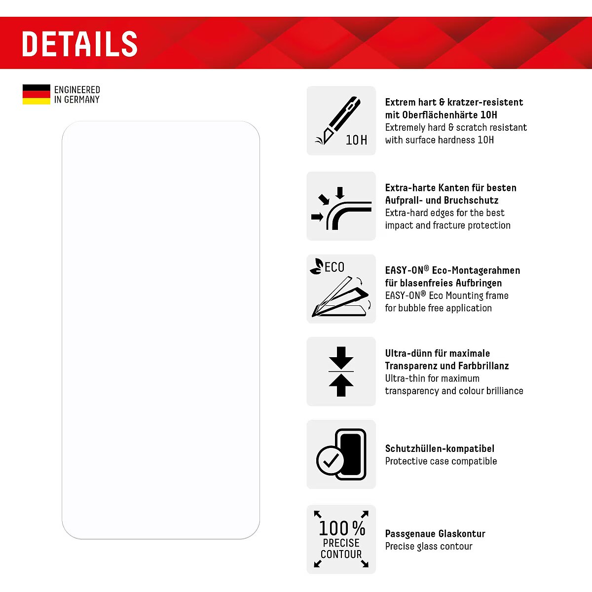 LongDesc - Real Glass (2D) with EASY-ON® Eco Mounting Frame Tempered glass with rounded edgesAll Displex protective glasses have a surface hardness of 10H and are therefore not only more scratch-, break- and shock-resistant than comparable brand products, but even surpass sapphire glass, which is used in luxury watches and has a hardness of 9H.Even the edges, the area of the smartphone and protective glass most susceptible to breakage and impact, are specially hardened, rounded by 4-fold polishing and finished with a shock-absorbing edge. This elaborate production process further increases the protection against knocks and bumps and allows a particularly pleasant use of the smartphone. With these features, the protective glass is extremely resistant and guarantees maximum breakage resistance. Case-friendlyOur Displex protective glass is manufactured to within 5/100 mm of the smartphone contours and therefore fits perfectly on your smartphone. In addition, the protective film is ultra-thin at 3mm. This means that all standard-sized protective cases can be used with the screen protection glass. Thus, your smartphone is optimally protected all around by a combined protection of the Displex Tempered Glass and your favourite case. Anti fingerprint coatingThe top layer of our 4-Layer Technology is a high-tech plasma coating. With an extremely long-lasting effect, this coating effectively repels fingerprints. In addition, the plasma coating guarantees a soft scrolling experience. This technology not only makes your display look better, but it also keeps it cleaner and therefore requires less frequent cleaning. High-tech splinter protectionThe high-tech shatter protection integrated in the Real Glass from Displex guarantees absolute safety even if the protective glass breaks. Thanks to the composite material of the second layer in the protective glass, it does not shatter and thus guarantees absolutely safe use. If the worst should come to the worst and the protective glass has absorbed a blow, fall or impact and is broken, the Displex protective glass can be easily pulled off the display in one piece thanks to the integrated high-tech shatter protection. High-performance adhesiveOnce the protective glass has been fitted, the high-performance adhesive ensures optimum adhesion properties and a clear look. The adhesive is adapted to all display coatings of the various manufacturers so that the protective film for mobile phones holds reliably in the long term. The visual appearance is not affected either: despite the screen protection film, you can enjoy gripping videos and photos with maximum transparency and colour fidelity. Simple & bubble-free applicationWith the EASY-ON® Eco Mounting Frame and the accompanying video tutorials, mounting the tempered glass is incredibly quick, easy and precise. In addition the EASY-ON® Eco Mounting Frame is made of premium solid cardboard and is therefore not only sustainable, but also a 100% recyclable. The result is worth seeing: no crooked positioning of the screen protector on the display, no concealed openings for speakers or microphones and certainly no bubbles under the protective glass.