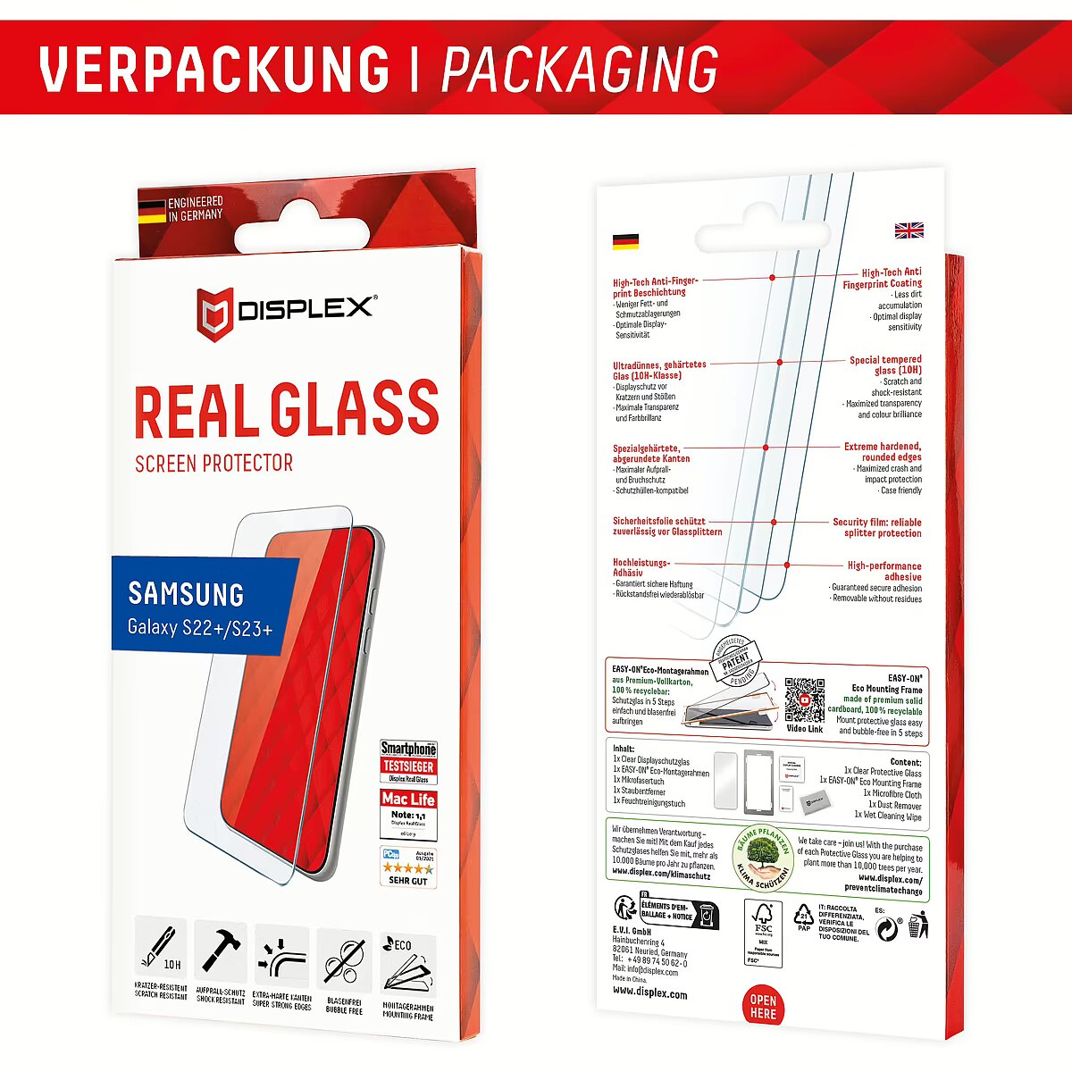 Displex Panzerglas 2D/Clear (10H) für Samsung Galaxy S22+/S23+, Eco-Montagerahmen, Tempered Glas, kratzer-resistente Glasschutzfolie, hüllenfreundlich