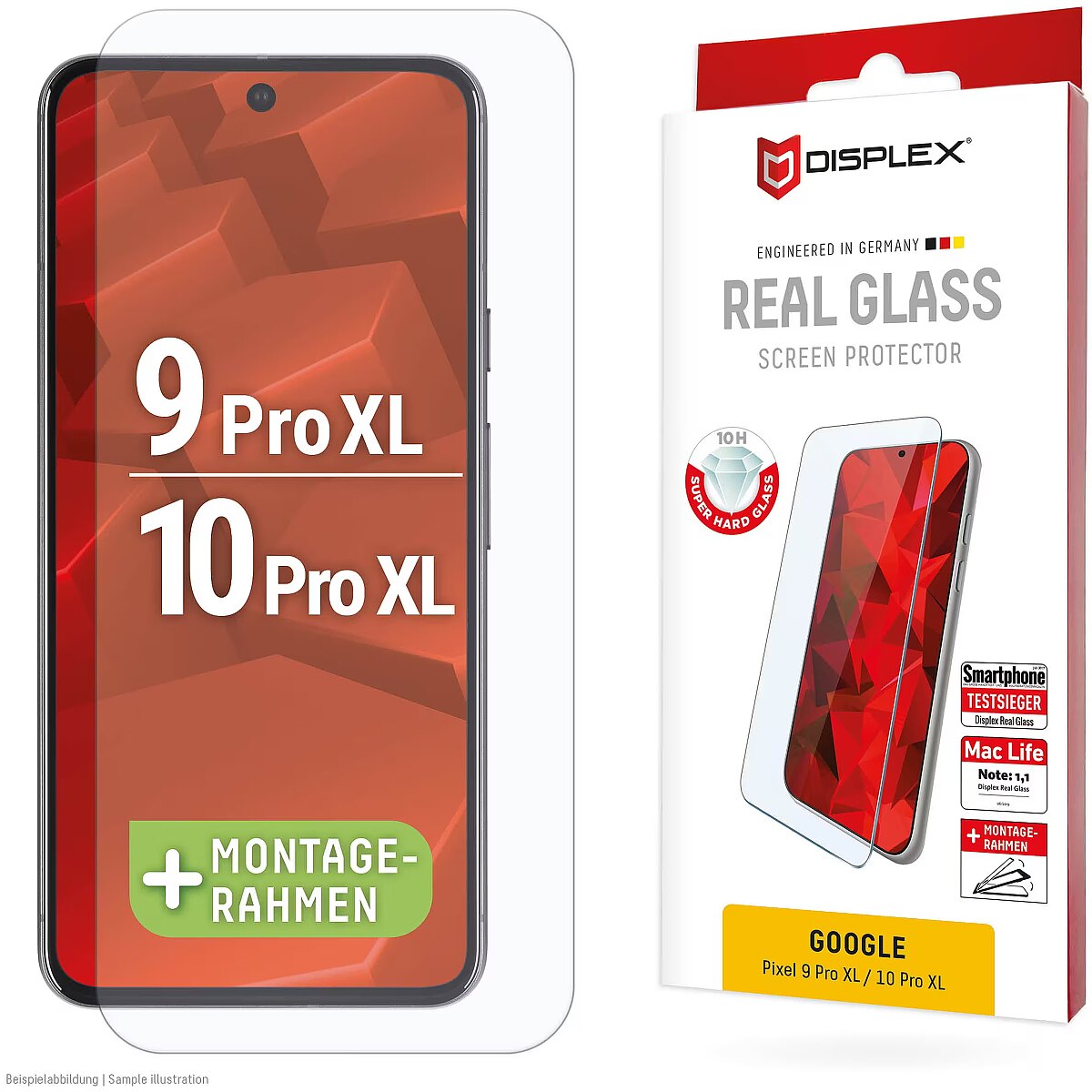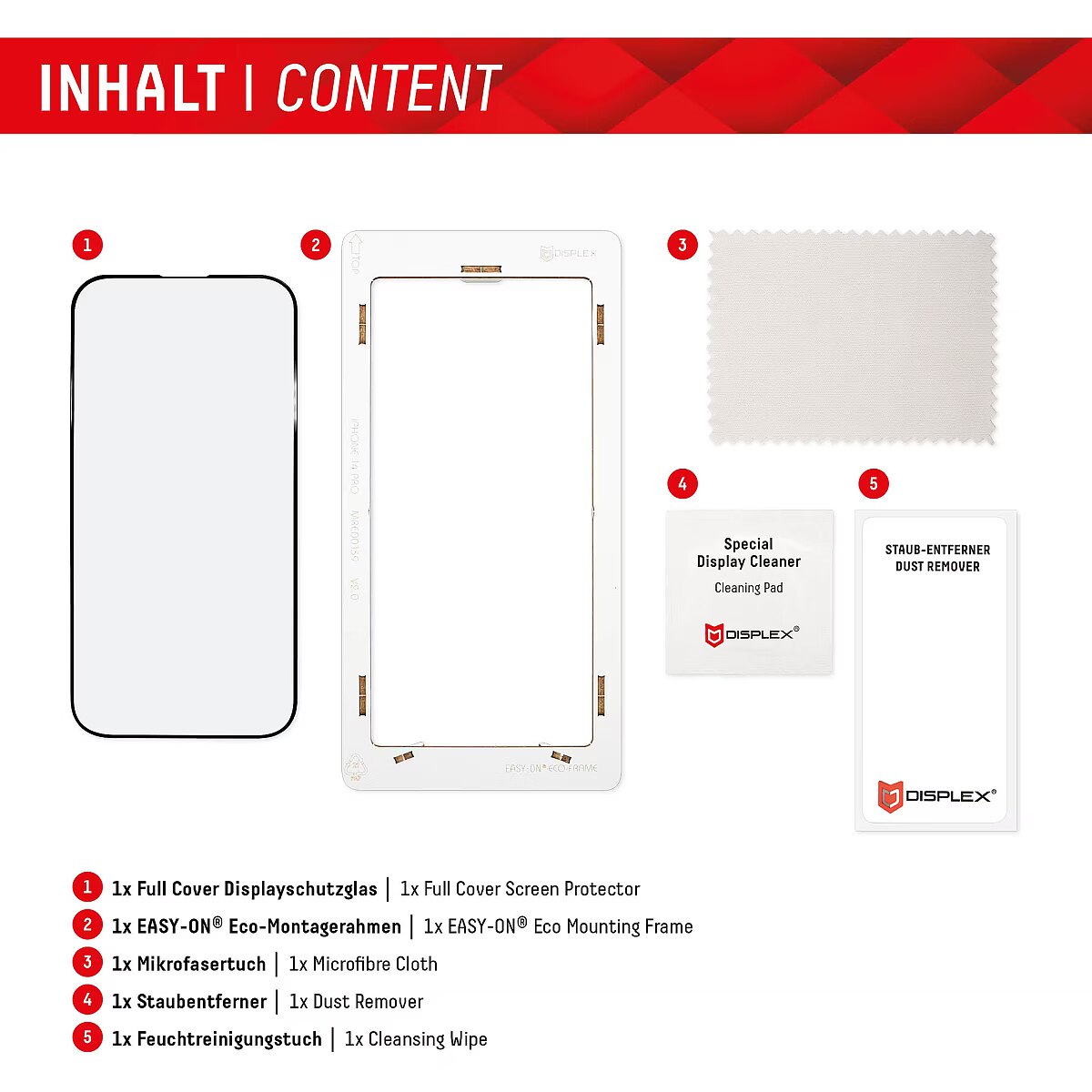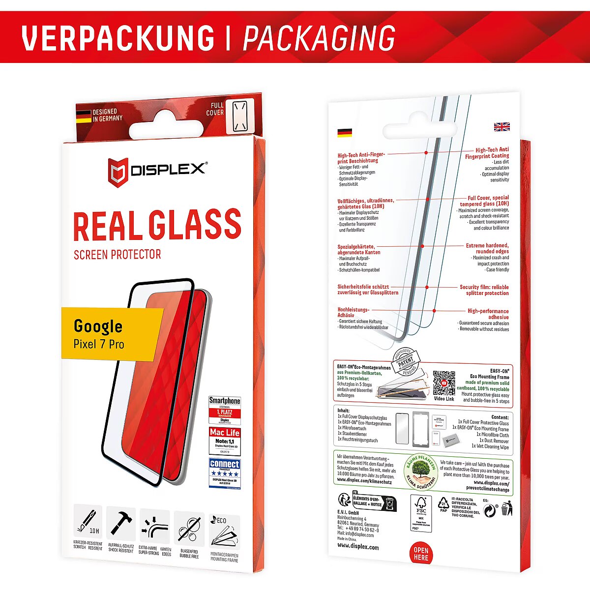 LongDesc - Full Cover or 3D/ Curved Real Glass with EASY-ON® Eco Mounting Frame Full screen coverageCompared to the so-called 2D protective glasses, Displex Full Cover protective glasses cover not only the active display area, but the entire display area. This means optimum protection of the entire display and an improved user experience: maximum protection without annoying edges.This feature is particularly advantageous for smartphones with rounded displays. Since the screen protector adapts perfectly to the rounded display and thus protects the entire display area. Tempered glass with rounded edgesAll Displex protective glasses have a surface hardness of 10H and are therefore not only more scratch-, break- and shock-resistant than comparable brand products, but even surpass sapphire glass, which is used in luxury watches and has a hardness of 9H.Even the edges, the area of the smartphone and protective glass most susceptible to breakage and impact, are specially hardened, rounded by 4-fold polishing and finished with a shock-absorbing edge. This elaborate production process further increases the protection against knocks and bumps and allows a particularly pleasant use of the smartphone. With these features, the protective glass is extremely resistant and guarantees maximum breakage resistance. Case-friendlyOur Displex protective glass is manufactured to within 5/100 mm of the smartphone contours and therefore fits perfectly on your smartphone. In addition, the protective film is ultra-thin at 3mm. This means that all standard-sized protective cases can be used with the screen protection glass. Thus, your smartphone is optimally protected all around by a combined protection of the Displex Tempered Glass and your favourite case. Anti fingerprint coatingThe top layer of our 4-Layer Technology is a high-tech plasma coating. With an extremely long-lasting effect, this coating effectively repels fingerprints. In addition, the plasma coating guarantees a soft scrolling experience. This technology not only makes your display look better, but it also keeps it cleaner and therefore requires less frequent cleaning. High-tech splinter protectionThe high-tech shatter protection integrated in the Real Glass from Displex guarantees absolute safety even if the protective glass breaks. Thanks to the composite material of the second layer in the protective glass, it does not shatter and thus guarantees absolutely safe use. If the worst should come to the worst and the protective glass has absorbed a blow, fall or impact and is broken, the Displex protective glass can be easily pulled off the display in one piece thanks to the integrated high-tech shatter protection. High-performance adhesiveOnce the protective glass has been fitted, the high-performance adhesive ensures optimum adhesion properties and a clear look. The adhesive is adapted to all display coatings of the various manufacturers so that the protective film for mobile phones holds reliably in the long term. The visual appearance is not affected either: despite the screen protection film, you can enjoy gripping videos and photos with maximum transparency and colour fidelity. Simple & bubble-free applicationWith the EASY-ON® Eco Mounting Frame and the accompanying video tutorials, mounting the tempered glass is incredibly quick, easy and precise. In addition the EASY-ON® Eco Mounting Frame is made of premium solid cardboard and is therefore not only sustainable, but also a 100% recyclable. The result is worth seeing: no crooked positioning of the screen protector on the display, no concealed openings for speakers or microphones and certainly no bubbles under the protective glass.