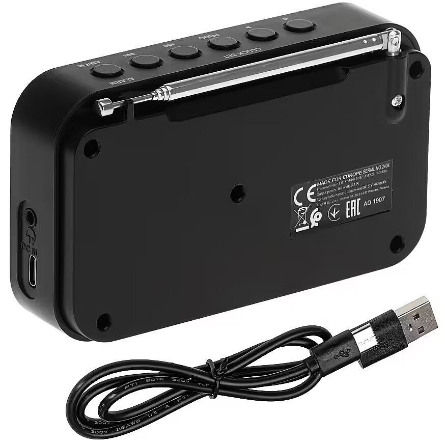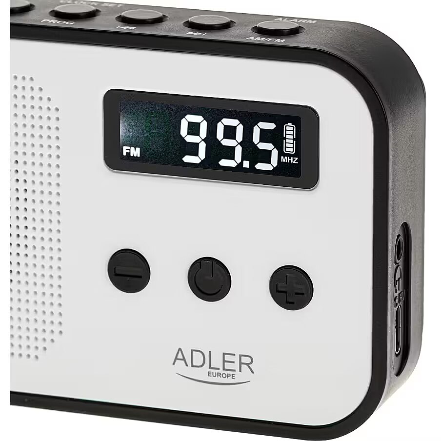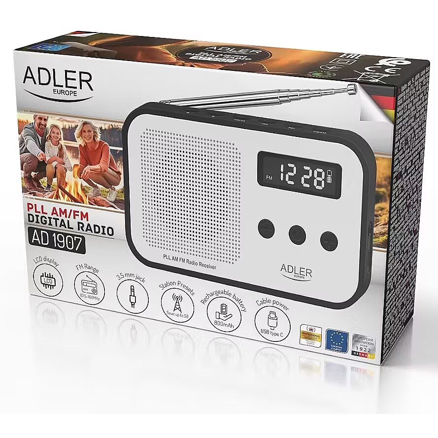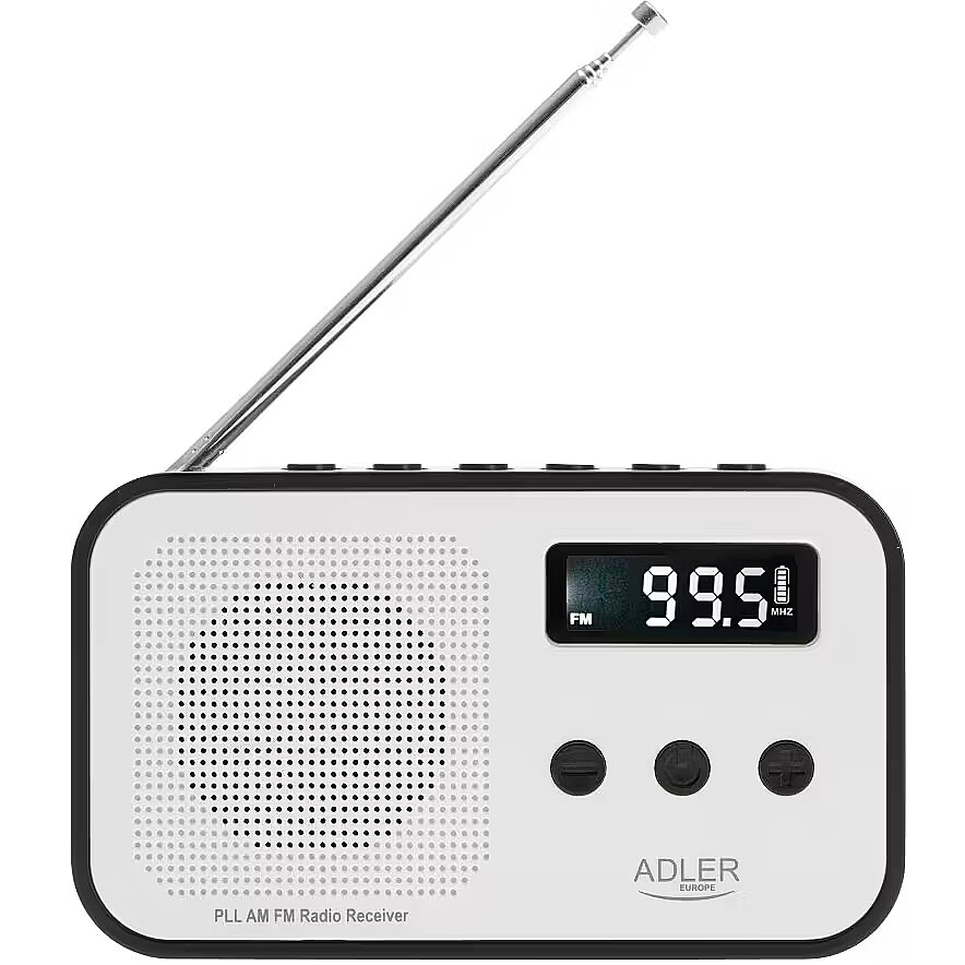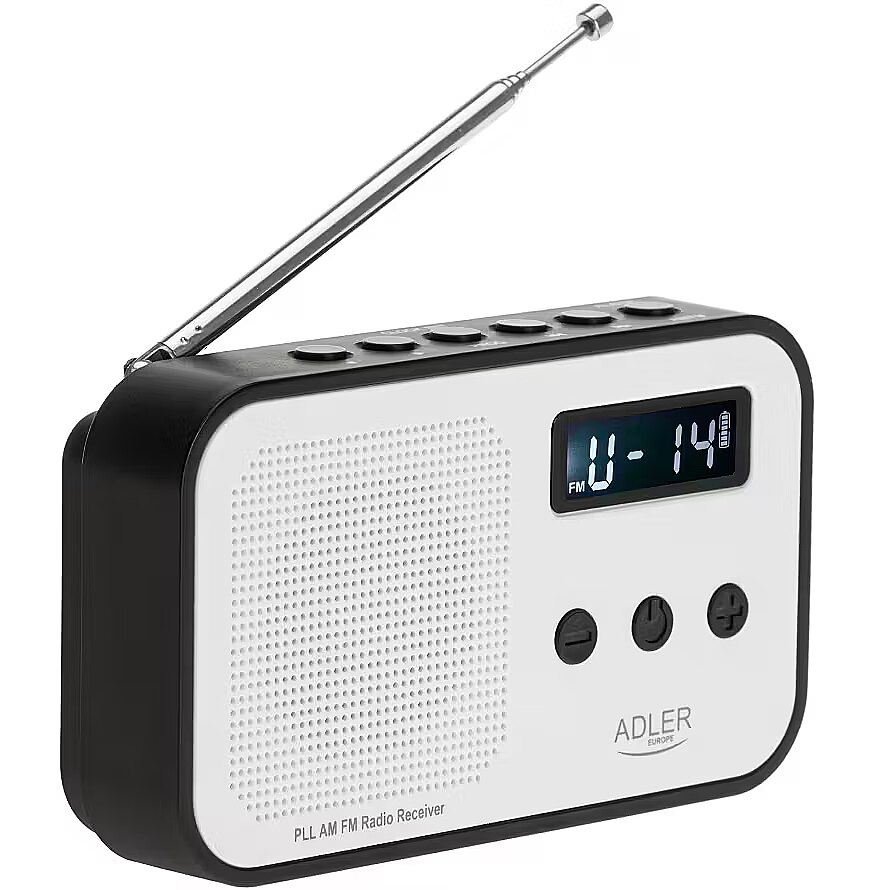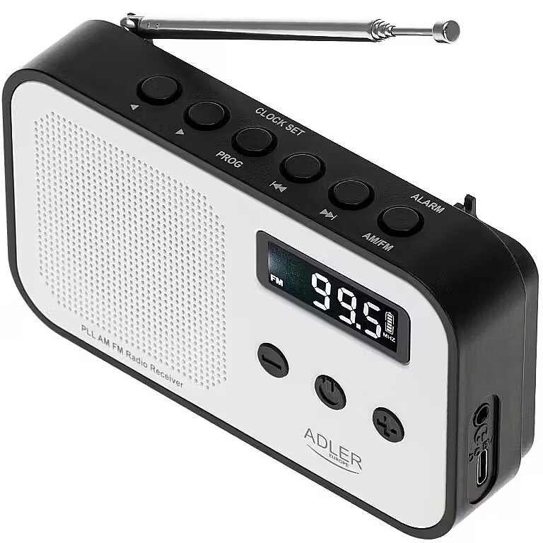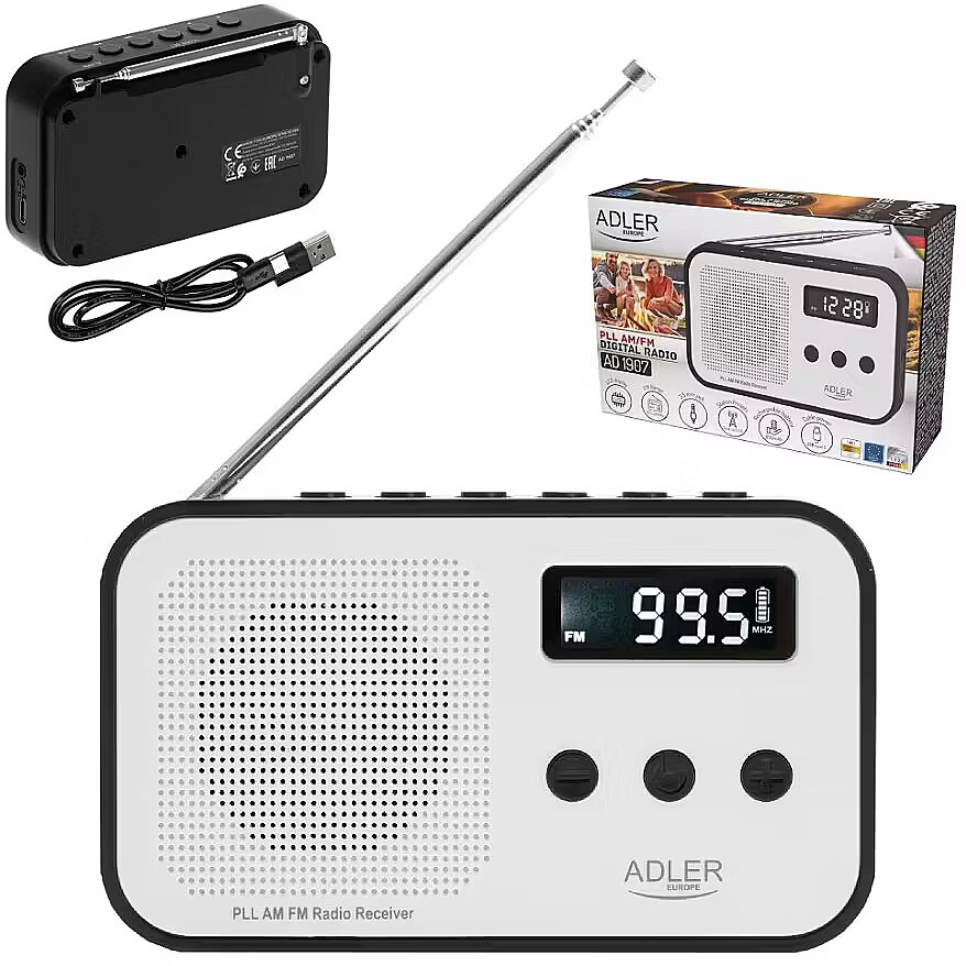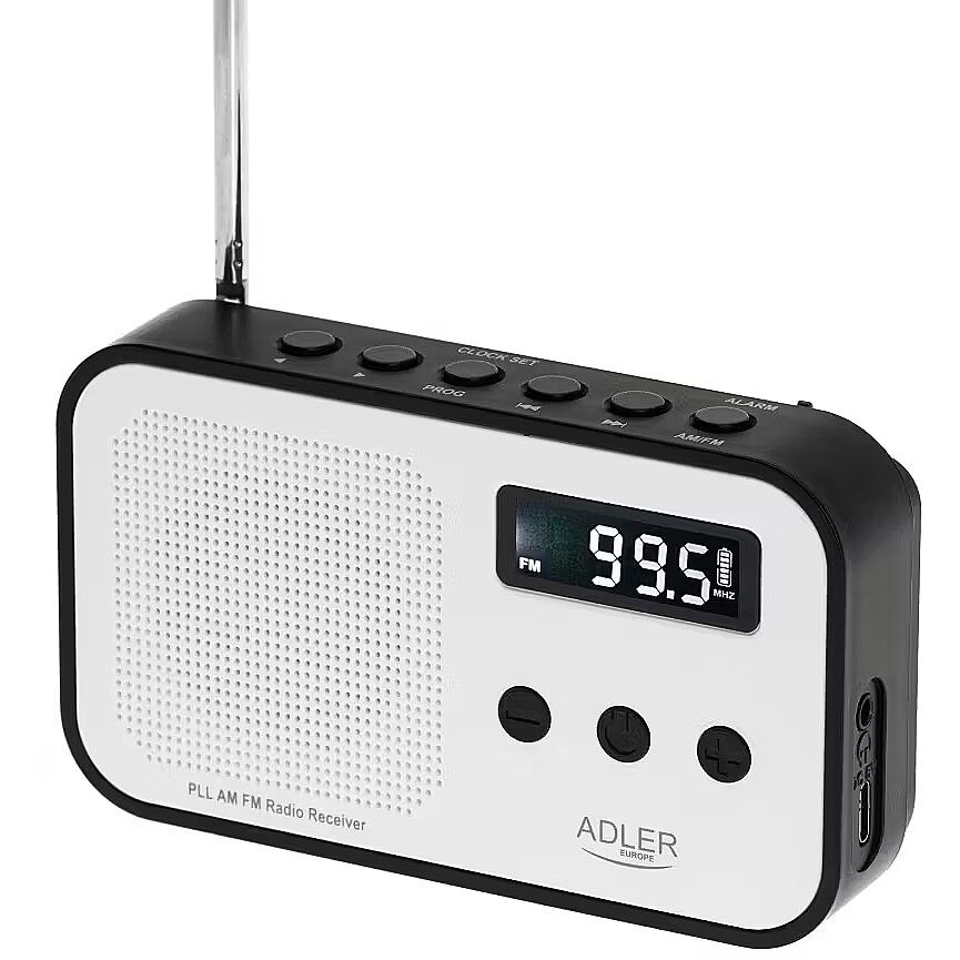Description - Adler AD 1907 to kompaktowe i nowoczesne radio cyfrowe PLL AM/FM, które zapewnia doskonałą jakość dźwięku oraz wygodę użytkowania. Dzięki automatycznemu systemowi strojenia PLL pozwala na precyzyjne wyszukiwanie stacji radiowych, a szeroki zakres częstotliwości umożliwia odbiór ulubionych programów zarówno na falach FM, jak i AM. Kluczowe cechy: Automatyczny system strojenia PLL - szybkie i precyzyjne wyszukiwanie stacji Szeroki zakres częstotliwości: FM: 87,5 - 108 MHz AM: 522 - 1620 kHz Możliwość zapisania 40 stacji - 20 dla FM i 20 dla AM Czytelny wyświetlacz LCD - wygodne sterowanie i łatwa obsługa Antena teleskopowa - poprawia odbiór sygnału i zwiększa jakość dźwięku Wbudowane funkcje: Zegar Budzik Drzemka Uśpienie Gniazdo słuchawkowe 3,5 mm - możliwość słuchania w trybie prywatnym Optymalna moc 0,6 W - czysty i wyraźny dźwięk Wbudowany akumulator 600 mAh - dłuższy czas pracy bez konieczności ładowania Nowoczesne zasilanie USB-C - szybkie i wygodne ładowanie
