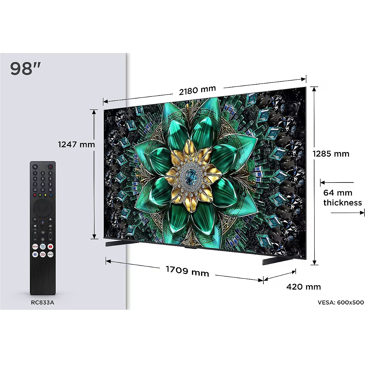 Summary - TCL Q6C 98Q6C. Display diagonal: 2.49 m (98"), Display resolution: 3840 x 2160 pixels, HD type: 4K Ultra HD, Display technology: QD-Mini LED, Screen shape: Flat. Smart TV. Motion interpolation technology: PPI (Picture Performance Index) 4100, Native aspect ratio: 16:9. Digital signal format system: DVB-C, DVB-S2, DVB-T2. Wi-Fi, Ethernet LAN. Product colour: Metallic