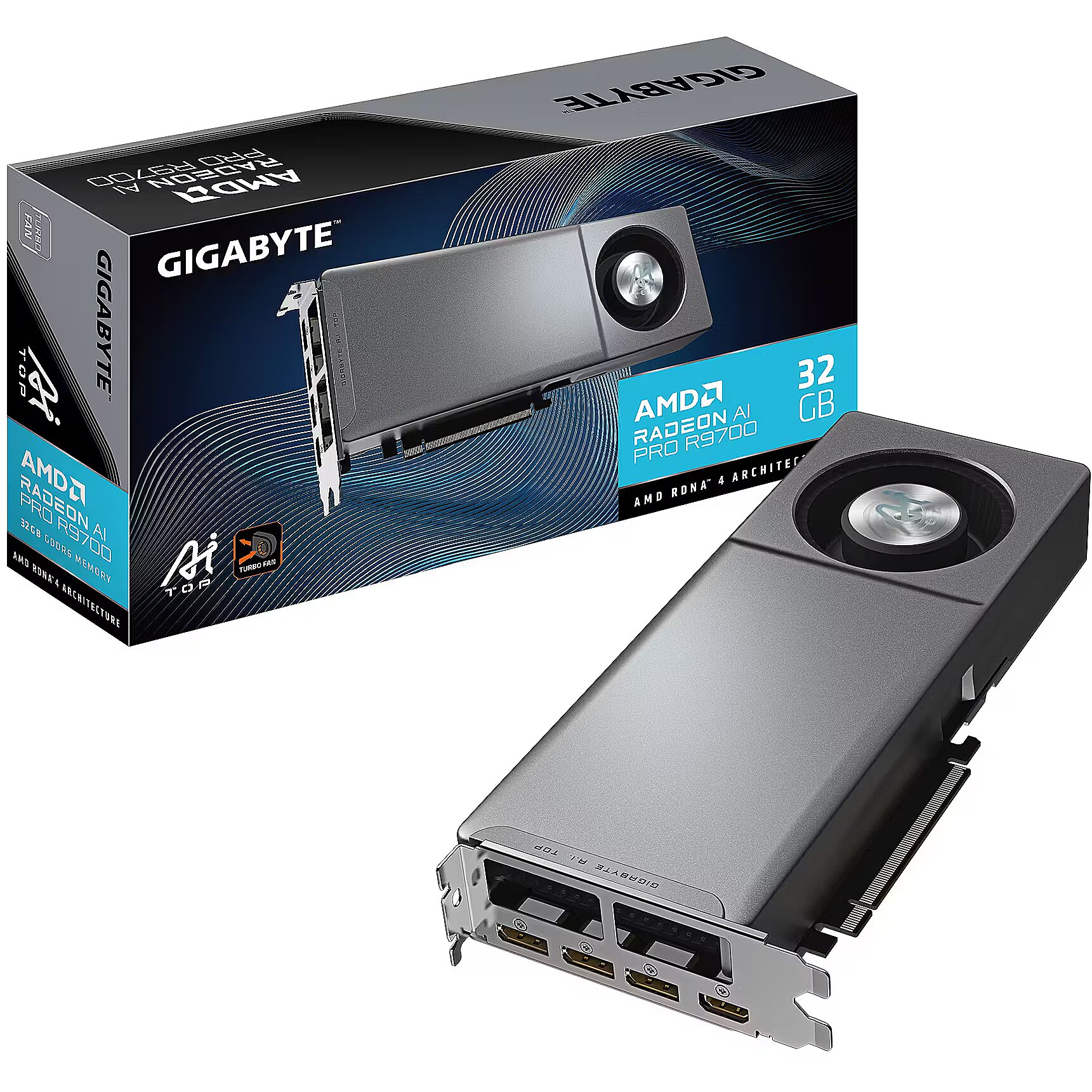 ShortSummaryDescription - GIGABYTE Radeon AI PRO R9700 AI TOP 32G Graphics Card- 32GB GDDR6, 256 bit, PCI-E 5.0, 2920MHz Core Clock, 3 x DP, 1 x HDMI, GV-R9700AI TOP-32GD 1.1, Radeon AI PRO R9700, 32 GB, GDDR6, 256 bit, 7680 x 4320 pixels, PCI Express x16 5.0