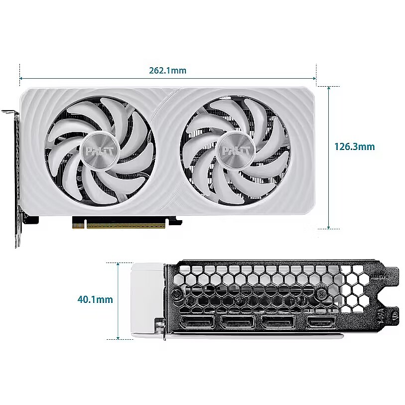 Palit GeForce RTX 5060 White oferuje klasyczną wydajność chłodzenia w czystym, nowoczesnym, białym wzornictwie. Dwa wentylatory 95 mm zapewniają wysoką wydajność chłodzenia i niski poziom hałasu, a wszystko to w kompaktowej, 2-slotowej obudowie, idealnej do małych obudów. Wytrzymała, biała płyta tylna podkreśla zarówno konstrukcję, jak i styl.