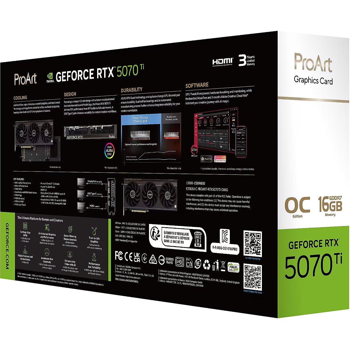 LongDesc - Visionary. Versatile. Timeless.The ProArt GeForce RTX™ 5070 Ti combines a compact 2.5-slot design with potent cooling – three Axial-tech fans, a vapor chamber, and a phase-change GPU thermal pad – to deliver GeForce RTX 50 Series performance to both full-scale towers and space-saving SFF builds. A USB Type-C® port enhances versatility for content creation workflows, while a wood-patterned laminate trim and low-key Aura-lit logo help deliver a refined aesthetic.