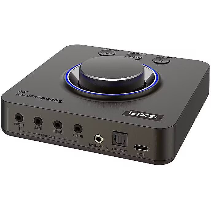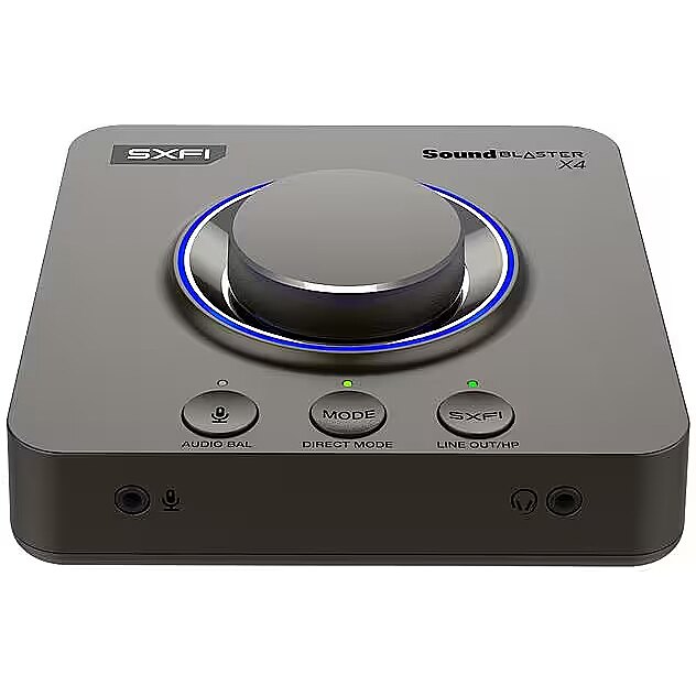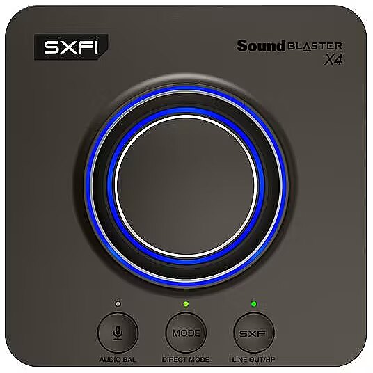 Description - External 7.1 High-Definition Audio Card with Amplifier, USB DAC and Super X-Fi and Smartcomms Module Kit 1 device. 3 surround sound technologies. 7 input/output connectors. Versatile audio enhancement with external Sound Blaster X4 card. Multi-channel sound Up to 7.1 Discrete channels on multi-channel speakers Up to 7.1 Virtual channels on headphones Surround sound Super X-Fi Headphone Holography Famous Sound Blaster Surround Virtualisation technology Dolby Digital Live Input/Output connections Line out and line in Optical output and optical input USB-C for power and audio Microphone input Headset input Communications SmartComms Kit with automatic muting and two-way noise reduction CrystalVoice for clear recordings and communication in games Controls Volume control knob Direct microphone mute button Three EQ modes and Direct Mode Super X-Fi and SXFI BATTLE mode on/off Speaker (line out) and headphone switch Audio Balance function Software Creative App via USB on Windows PC or Mac for full audio customisation Creative App via Bluetooth for Android and iOS for quick equalizer (EQ) adjustment and audio enhancement Headphone amplifier Supports headphone impedances from 32-600 Plays SXFI BATTLE mode for realistic sound cues, detail and depth Scout mode to instantly hear the quietest sounds made by enemies Sound and power 114 dB, 24-bit / 192 kHz Convenient USB-C bus power supply