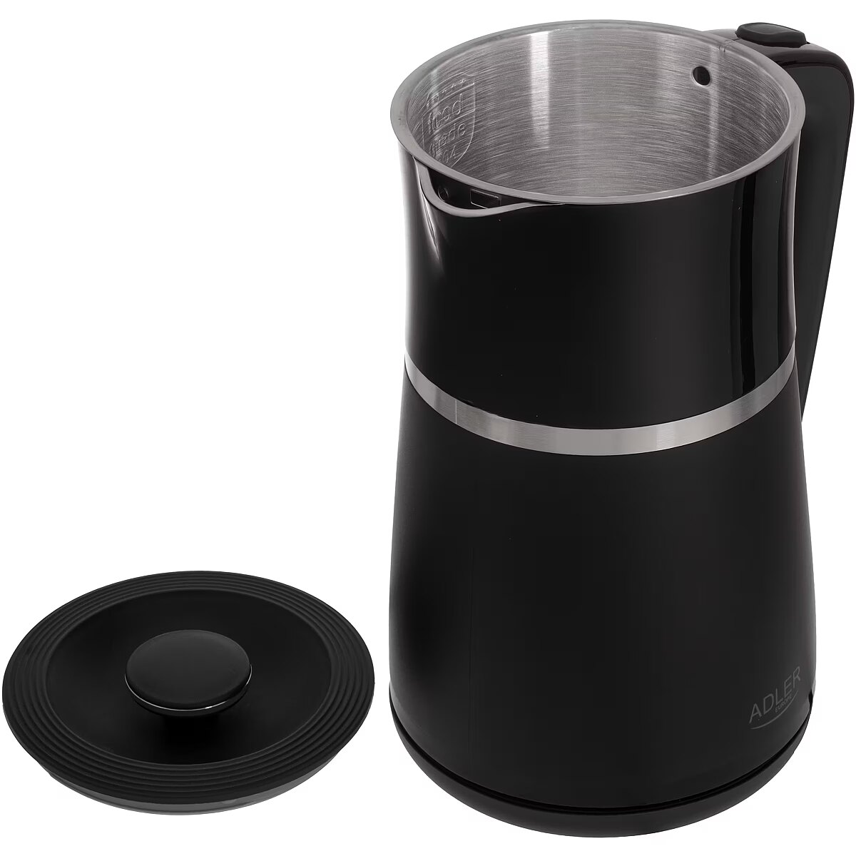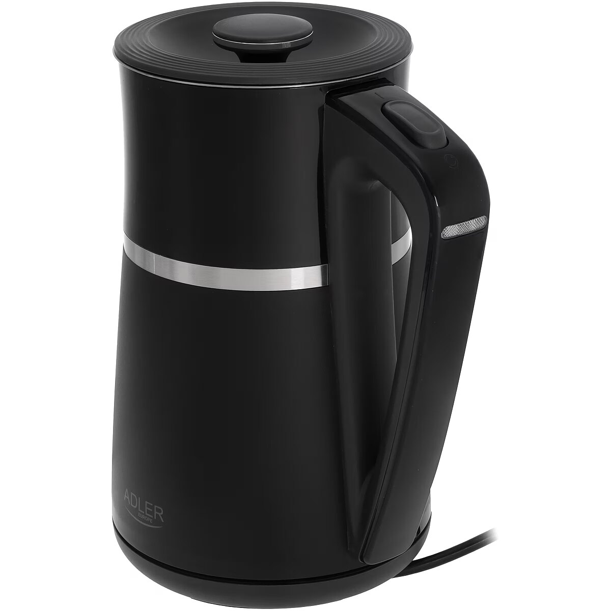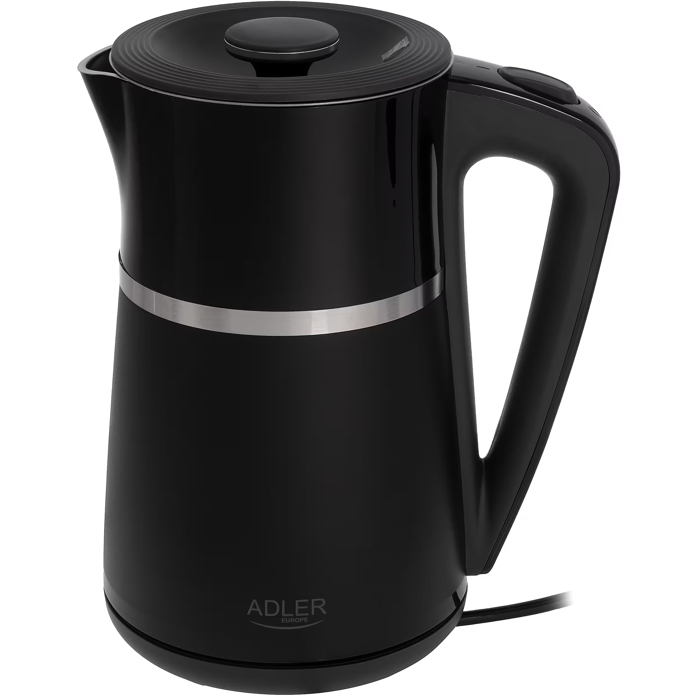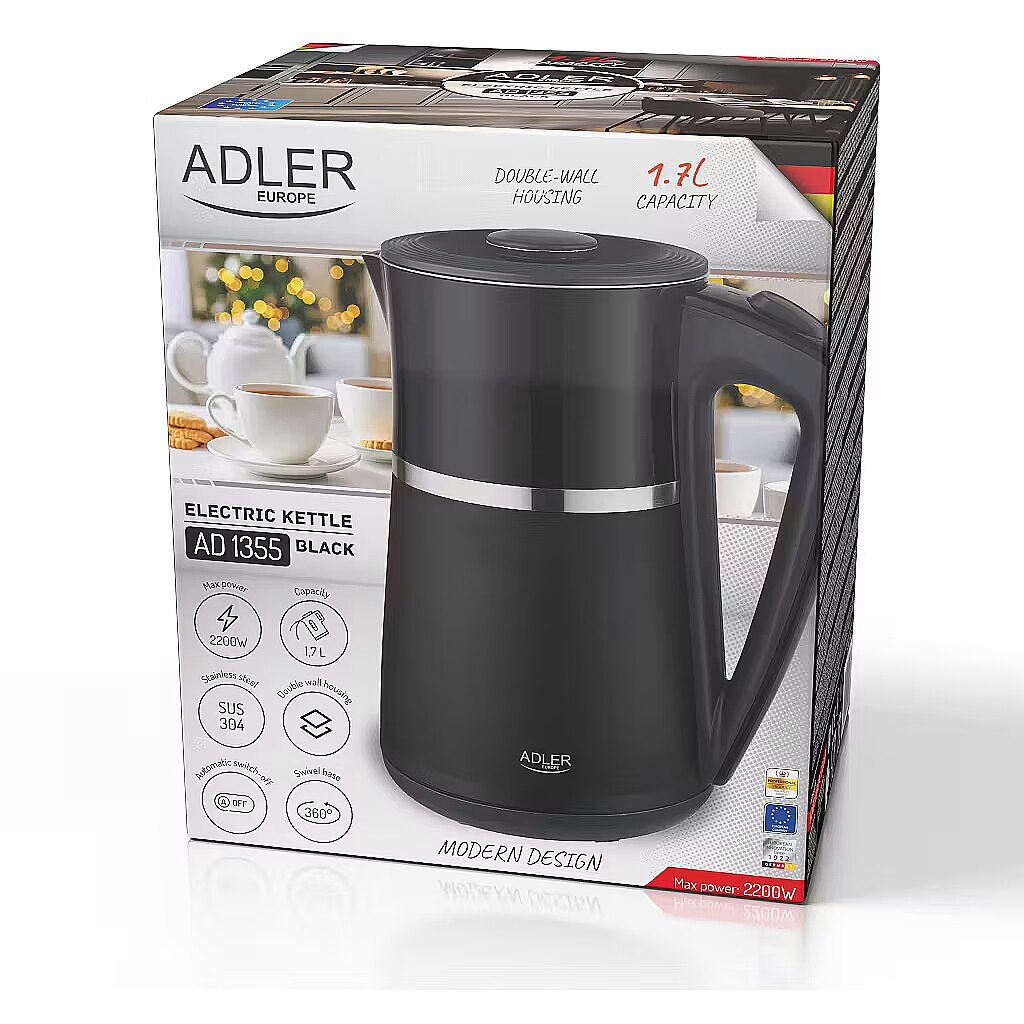 Description - Adler AD 1355 to połączenie nowoczesnego designu, bezpieczeństwa i wydajności. Czajnik o pojemności 1,7 L, z wnętrzem wykonanym ze stali nierdzewnej oraz trwałą, podwójną ścianką, zapewnia bezpieczne użytkowanie i dłużej utrzymuje temperaturę wody. Idealny do codziennego użytku w każdej kuchni. Najważniejsze cechy: Obudowa z podwójną ścianką - utrzymuje wysoką temperaturę wewnątrz, a zewnętrzna powierzchnia pozostaje bezpieczna w dotyku Duża pojemność: 1,7 L - doskonały dla całej rodziny Minimalna pojemność: 0,5 L - oszczędność energii przy mniejszych porcjach Obrotowa podstawa 360 - wygoda dla osób prawo- i leworęcznych Płaska grzałka ze stali nierdzewnej - szybkie gotowanie i łatwe czyszczenie Wnętrze ze stali szlachetnej - higieniczne i trwałe rozwiązanie Całkowicie zdejmowana pokrywa - łatwe nalewanie i czyszczenie Automatyczne wyłączanie po zagotowaniu - bezpieczna praca Zabezpieczenie przed gotowaniem na sucho + bezpiecznik termiczny - podwójna ochrona Schowek na przewód - porządek na blacie kuchennym Elegancki czarny design - pasuje do nowoczesnych kuchni
