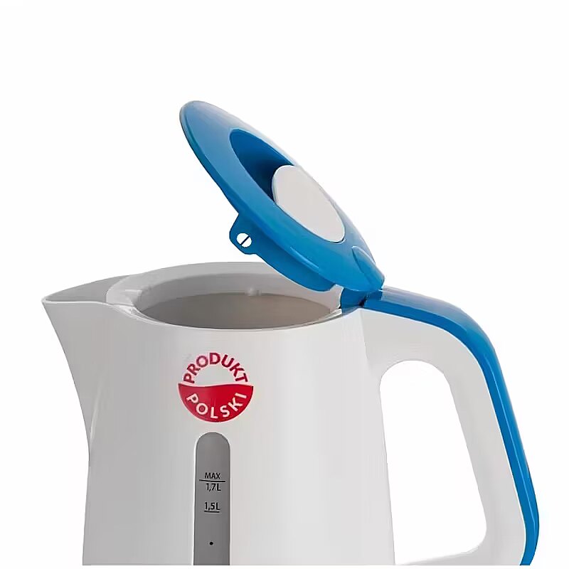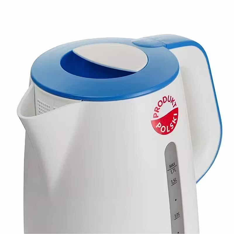 ShortDescription - Moc [W]: 1850 | Pojemność [l]: 1,7 | Ukryty element grzejny: tak | Kolor: biało-niebieski | Filtr: tak | Obrotowa podstawa: tak