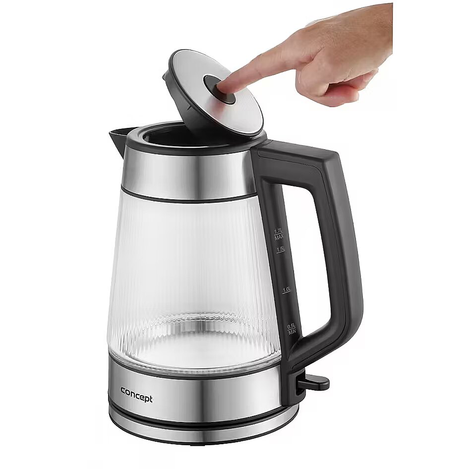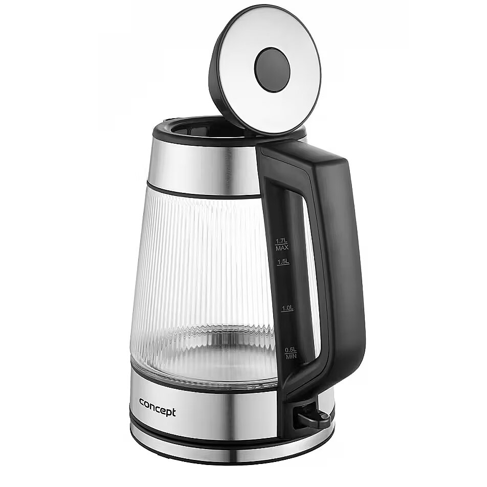Szklany czajnik elektryczny Concept RK4210 wyróżnia się nowoczesnym ryflowanym szkłem oraz elementami ze stali nierdzewnej. Dzięki pojemności 1,7 l można przygotować do 7 filiżanek ulubionego gorącego napoju. Jego elegancki wygląd podkreśla podświetlenie LED, które nie tylko działa jako wskaźnik pracy, ale również dodaje stylu i funkcjonalności. Wysoka jakość wykonania i trwałość