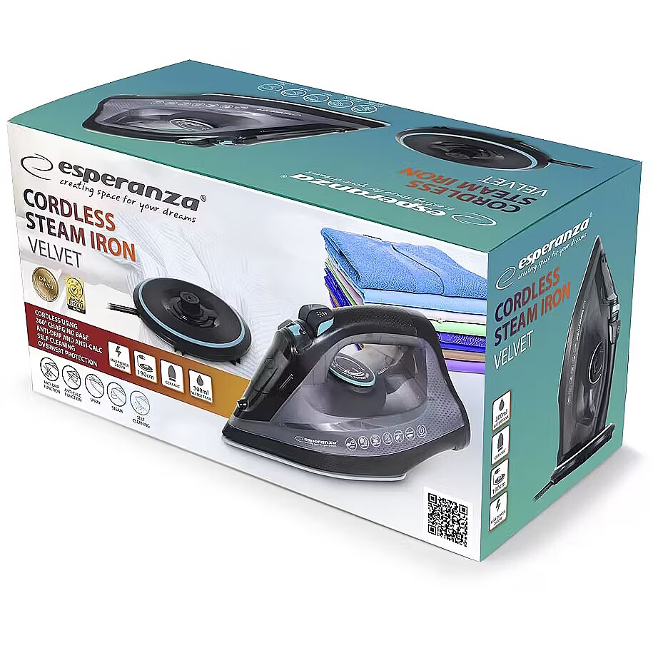 Description - The Esperanza VELVET cordless steam iron is a modern device that combines ease of use with high ironing efficiency. Cordless operation provides freedom of movement and complete comfort when ironing various types of fabrics. The modern ceramic soleplate ensures smooth glide, even heat distribution, and effective wrinkle removal. The iron features an elegant design, ergonomic shape, and a range of features that enhance safety and durability. Ideal for both everyday home use and professional applications. Ironing freedom and reliable performance Cordless convenience  High-quality ceramic solenoid  Always perfect results no dropping or limescale  Power: 2600 W Power supply: AC 220-230 V / 50 Hz Fast heating Scratch-resistant ceramic soleplate Water tank capacity: 300 ml Dry and steam ironing functions Vertical ironing Spray and steam shot functions Self-cleaning system Overheating protection Anti-drip function prevents water dripping at low temperatures Anti-calc function protects against limescale Charging base cord length: 1.8 m