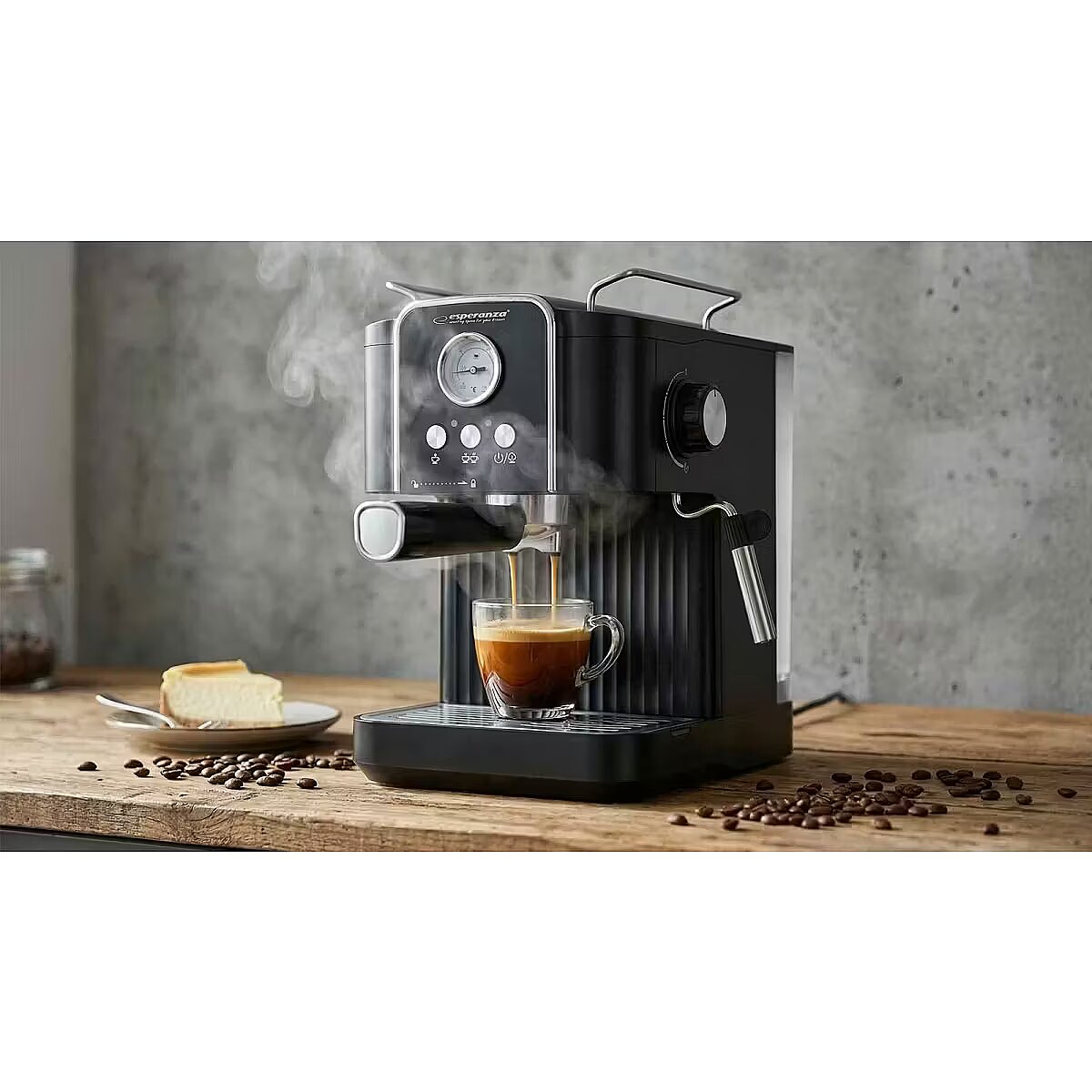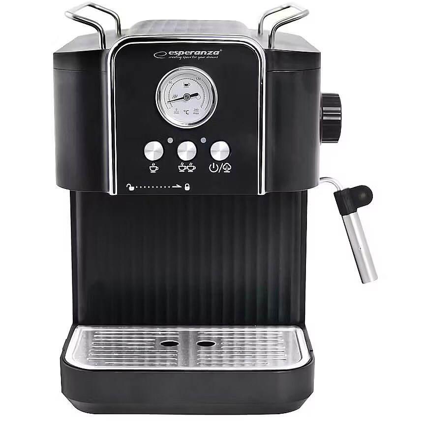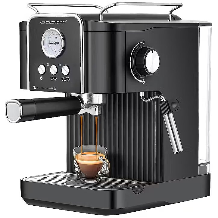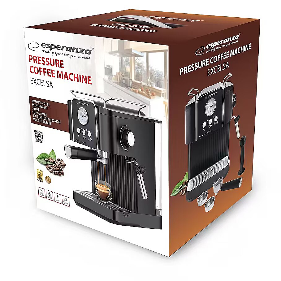 Description - The Esperanza EXCELSA is a modern and efficient espresso machine that allows you to enjoy excellent, freshly brewed coffee every day. Thanks to its 1.8-liter water tank, you can prepare up to 10 cups at a time, making it ideal for both home and office use. 850W of power and 20-bar pressure ensure fast brewing of coffee with a full, intense flavor and rich aroma. The machine is equipped with a practical milk frother, allowing you to prepare milk-based drinks such as cappuccino or caff latte. A built-in temperature gauge allows you to monitor the brewing process, and a heated cup plate maintains the right temperature for longer, ensuring your coffee retains its perfect flavor. Smooth steam control allows you to adjust the machine's operation to your individual preferences, and the elegant design makes the Esperanza EXCELSA a perfect fit in any modern kitchen.