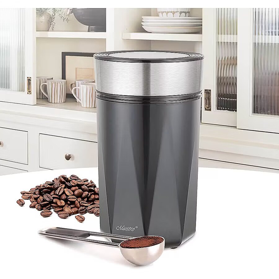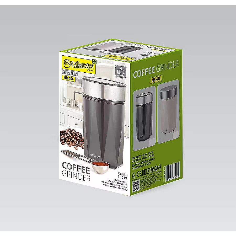 Description - Młynek do kawy Maestro MR-456-BLACK to praktyczne urządzenie, które doskonale sprawdzi się w kuchni każdego miłośnika świeżo mielonej kawy. Dzięki pojemności 50 g można w łatwy sposób zmielić odpowiednią ilość kawy na kilka filiżanek aromatycznego napoju. Młynek o mocy 150 W jest wyposażony w trwałe ostrza ze stali nierdzewnej, które efektywnie mielą ziarna kawy, przyprawy oraz orzechy, gwarantując perfekcyjną konsystencję.
