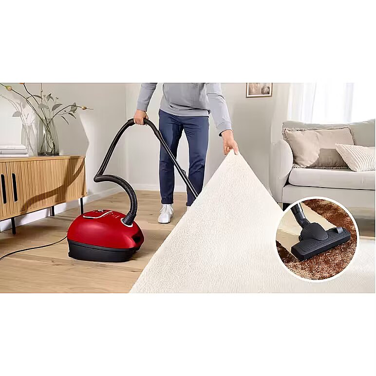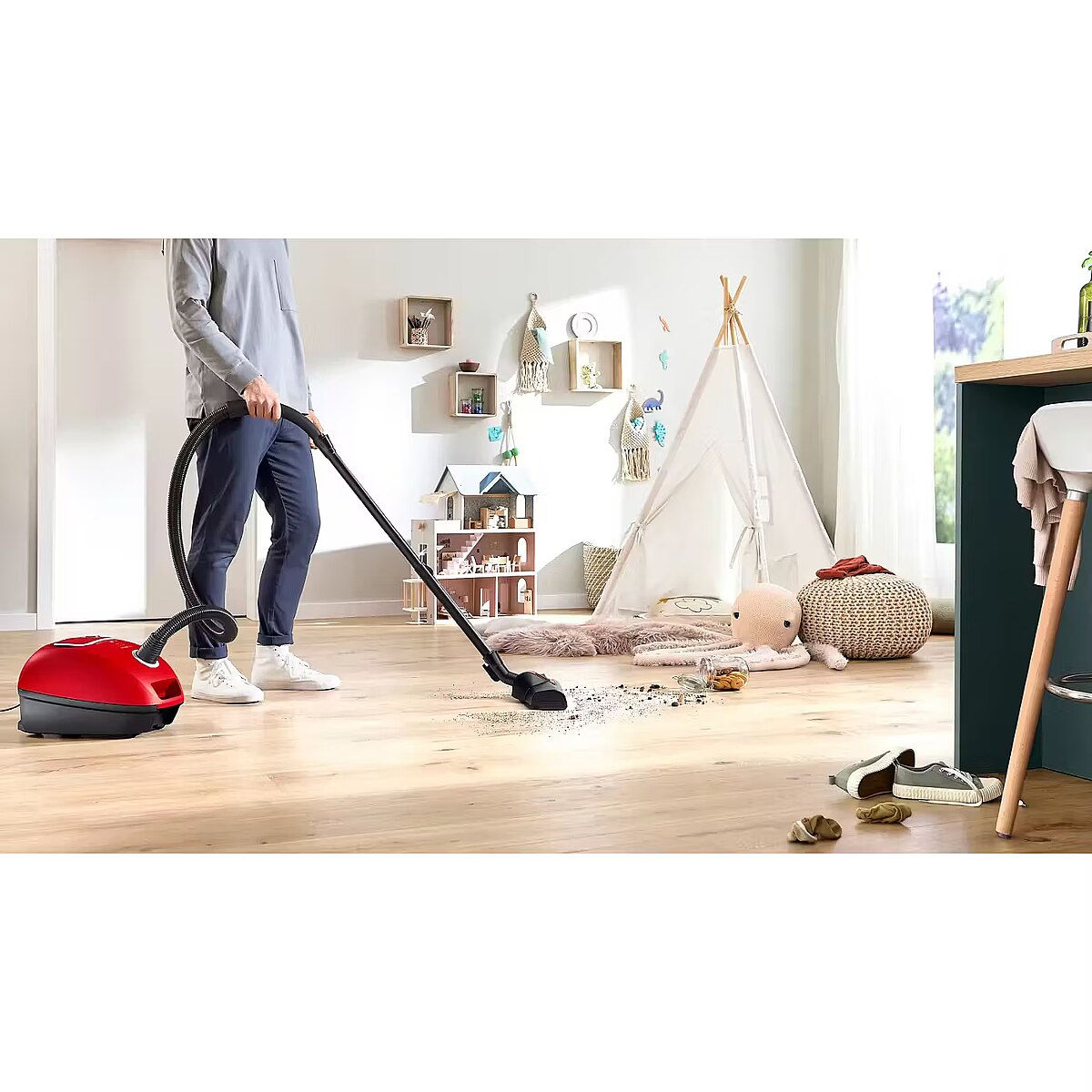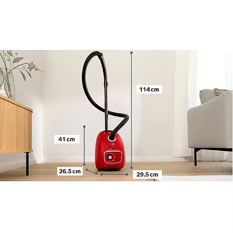 LongSummaryDescription - Bosch BGB41PET1. Maximum input power: 700 W. Type: Cylinder vacuum, Cleaning type: Dry, Dust container type: Dust bag, Dust capacity: 4 L. Vacuum air filtering: HEPA, Dirt separating method: Cyclonic, Noise level: 75 dB. Product colour: Black, Red