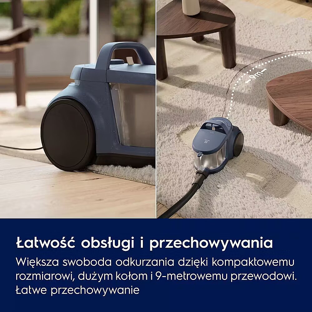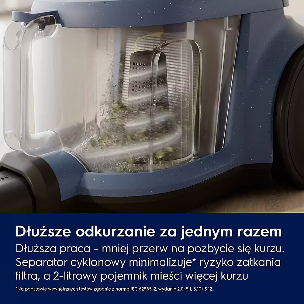 *In crevices, based on internal testing according to IEC 62885-2:2021, section 5.2. Bagless vacuum cleaner Line 500 EL51C1LDB Cyclonic separator vacuuming without clogging