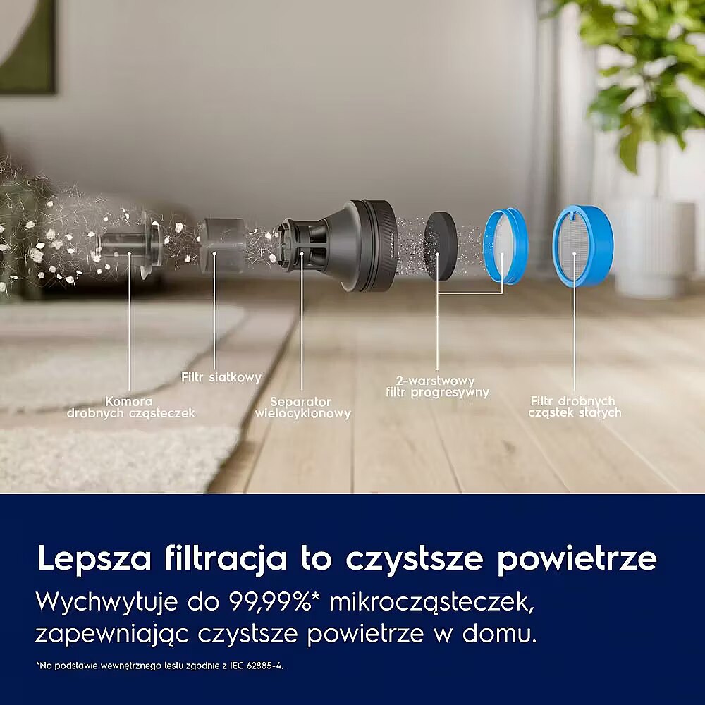The improved multi-cyclone separator delivers long-lasting strong suction while reducing filter clogging up to 5 times*. This minimizes the need for frequent filter cleaning or replacement.