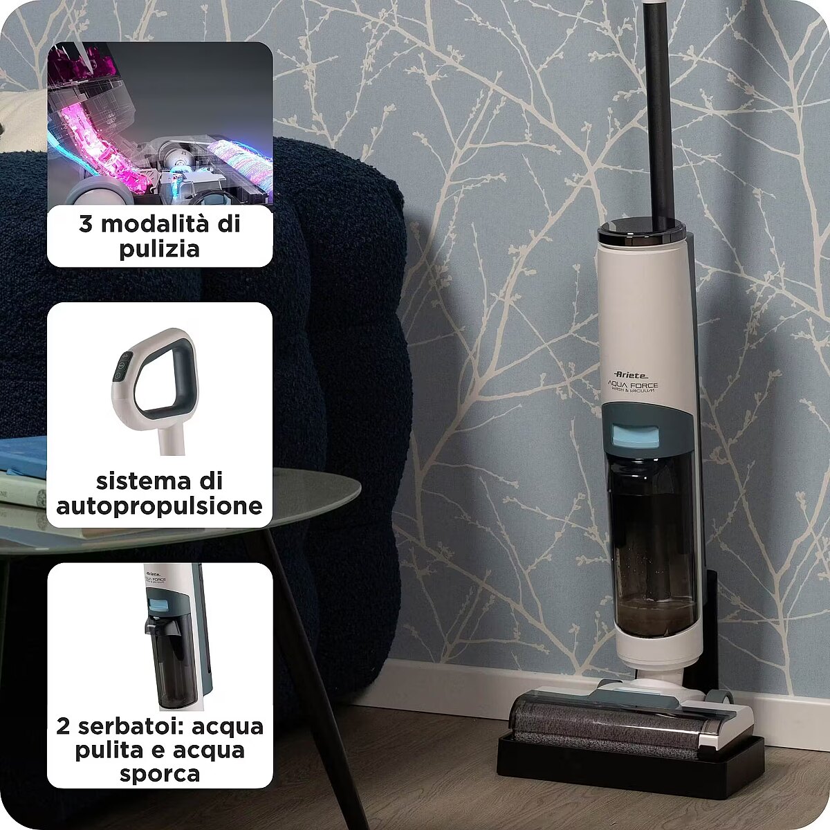 LongDesc - It's not just a cordless vacuum and floor cleaner: Aqua Force Wash & Vacuum is the perfect everyday cleaning ally to take care of your house. Aqua Force Wash & Vacuum simultaneously vacuums and cleans dry and wet dirt on all hard floors: tile, parquet, marble, laminate, terracotta. Thanks to the powerful suction force and integrated technology, surfaces will be dry within minutes after each pass, with no streaks or residual moisture.It is possible to choose between 3 modes:ECO with water: for daily cleaning, providing an autonomy of about 35 minutes;MAX with water: for the most stubborn dirt and provides an autonomy of 25 minutes;Suction only: for quick needs.Aqua Force Wash & Vacuum features a self-propulsion system that allows it to glide across the floor, and, thanks to its cordless design, cleaning becomes smoother and less tiring.Aqua Force Wash & Vacuum has two separate tanks: one for clean water (700 ml), where a specific detergent can be added, and one for dirty water (500 ml). It also features an integrated HEPA filter. With 2 water indicators on the digital display, Aqua Force Wash & Vacuum will alert you if clean water is missing or if the dirty water tank is full and needs to be emptied. The user-friendly digital display indicates suction mode, battery life, water indicator, self-cleaning, tangled roller, and spin drying. The brush, designed specifically for edge cleaning, stays clean, sanitized, and ready to use at all times thanks to the roller's self-cleaning system and centrifugal function.It will become your cleaning ally, and you won't be able to live without it!