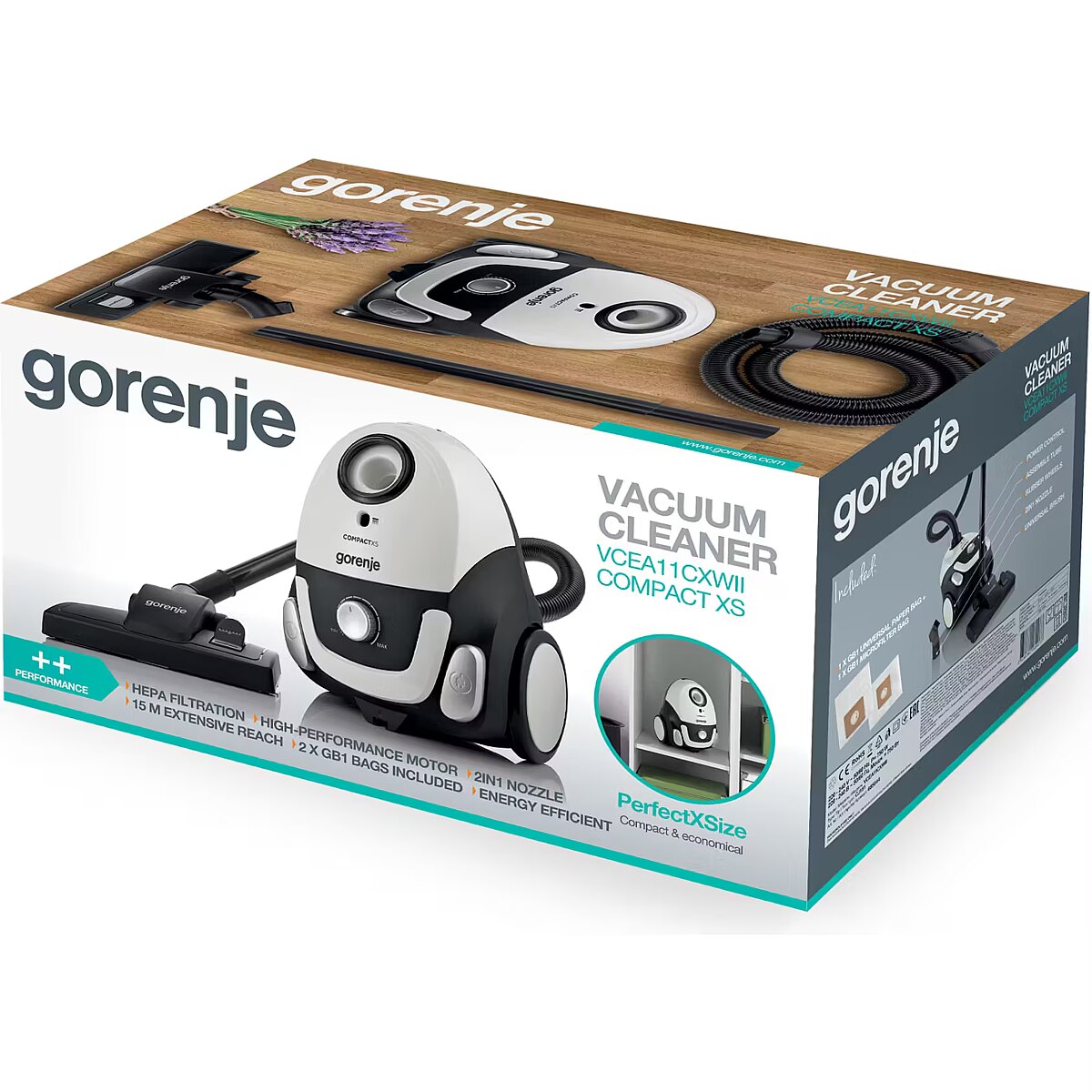 ShortSummaryDescription - Gorenje VCEA11CXWII, 750 W, Cylinder vacuum, Dry, Dust bag, 2 L, HEPA