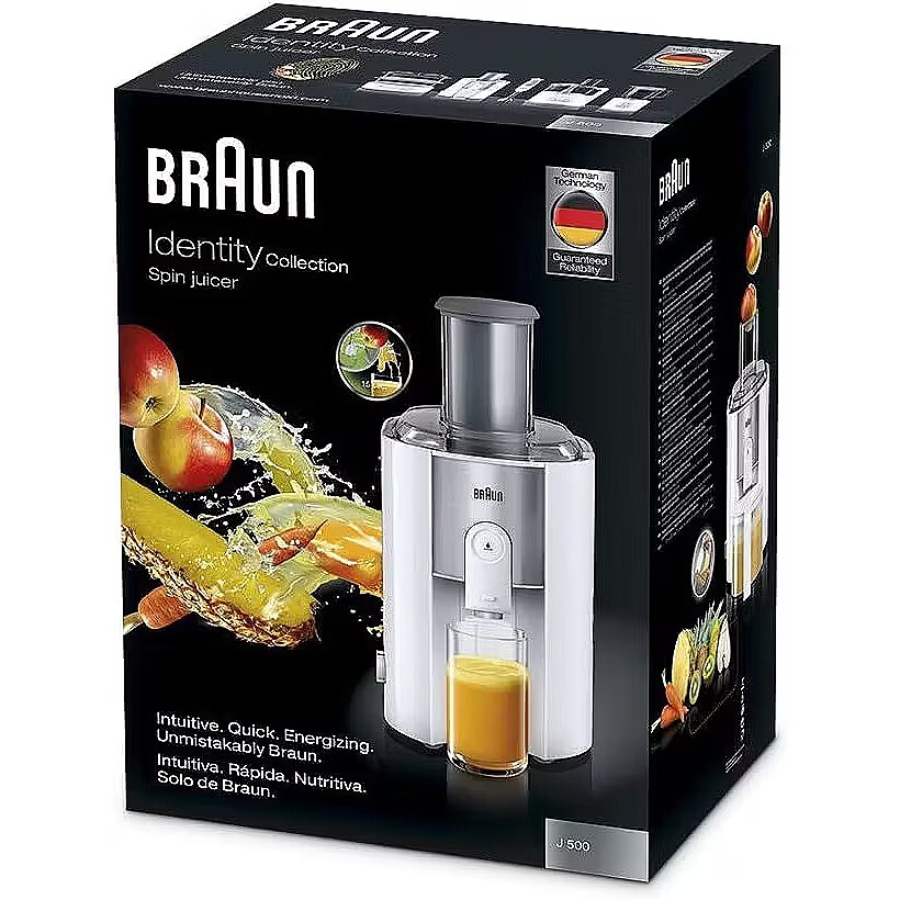 LongSummaryDescription - Braun J 500 WH. Product type: Juice extractor, Product colour: Stainless steel, White, Pulp container capacity: 2 L. Power: 900 W