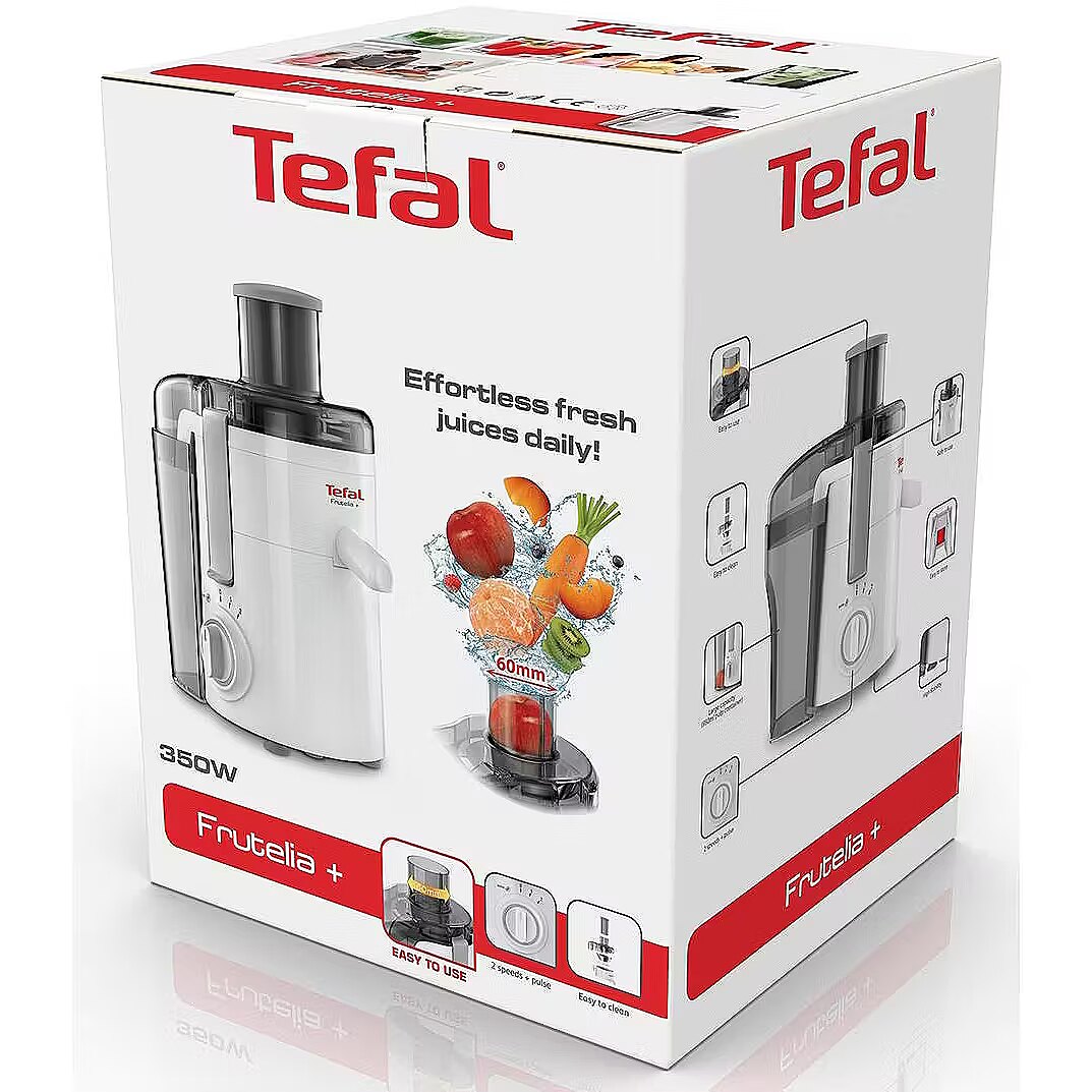 Technical details > Other features - With the Tefal Frutelia + juicer you will achieve perfect, healthy and delicious results every day, making it easy to make exceptional fresh fruit juice; Thanks to the wide opening, you can put in large pieces or even whole fruits or vegetables; The stainless steel filter ensures long-lasting performance, and the 950ml pulp collector is perfect for any occasion; A convenient compact frame for easy storage and safety features such as non-slip feet make Frutelia + the perfect juicer for every day