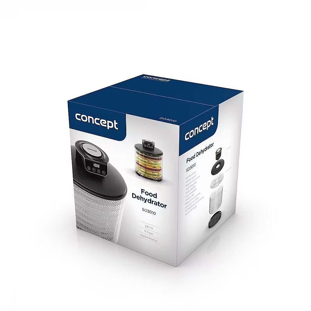 Suszarka do żywności Concept SO3010 wyposażona jest w 9 sit do suszenia i oferuje innowacyjne rozwiązanie konstrukcyjne. Silnik suszarki znajduje się w pokrywie, dzięki czemu jest on chroniony przed uszkodzeniami podczas suszenia, które mogłyby powstać na skutek kapania soków lub okruszków z suszonej żywności. Równomierne suszenie