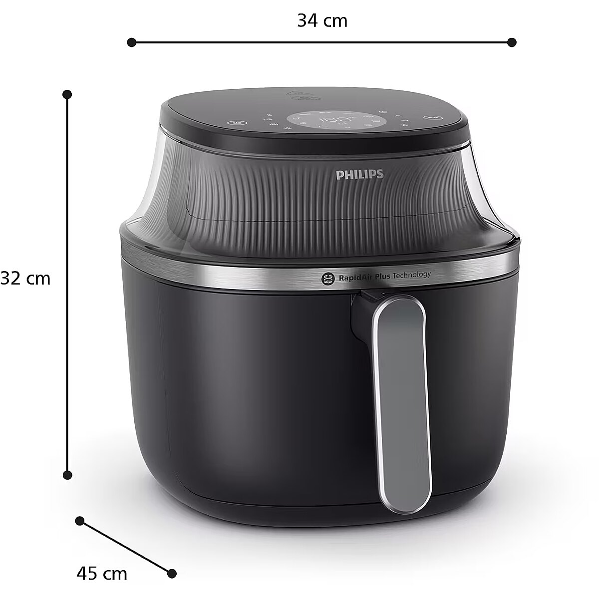 LongSummaryDescription - Philips 3000 series NA341/00. Product type: Hot air fryer, Capacity: 7.2 L, Fryer food capacity: 1.4 kg. Construction type: Single, Control type: Touch, Appliance placement: Stand-alone. Power: 2000 W, AC input voltage: 220-240 V, AC input frequency: 50 Hz. Width: 4530 mm, Depth: 3330 mm, Height: 303.5 mm. Package width: 406 mm, Package depth: 406 mm, Package height: 406 mm