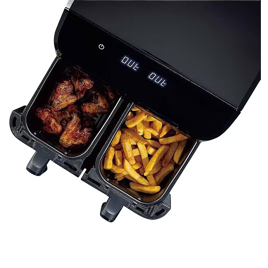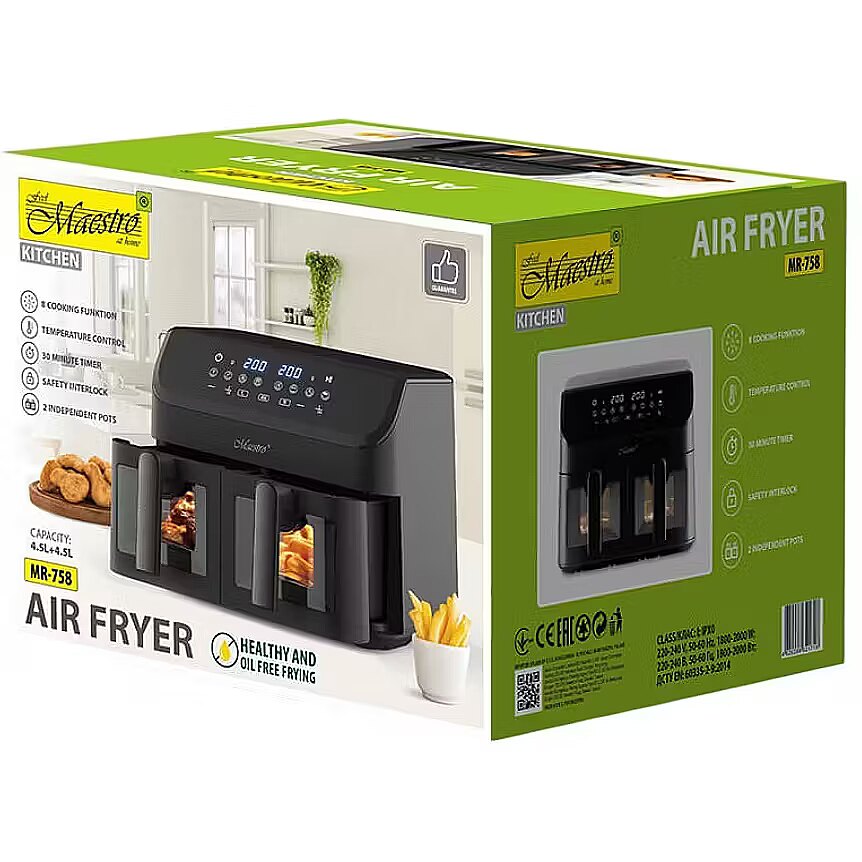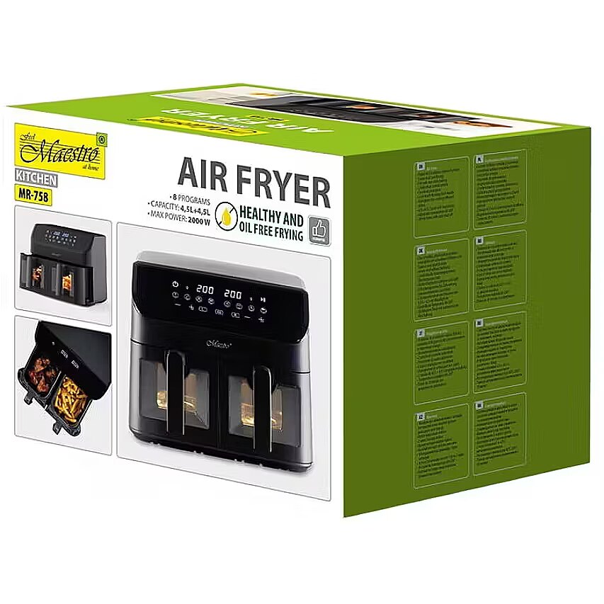 Description - Podwójna frytownica beztłuszczowa Air Fryer Maestro MR-758 o mocy max. 2000W to idealne rozwiązanie dla każdego, kto pragnie cieszyć się smakiem ulubionych potraw bez dodatku tłuszczu. Dzięki dwum pojemnym koszom o wielkości 4,5l, można przygotować zdrowe posiłki dla całej rodziny w jednym czasie. Wysokiej jakości powłoka non-stick wewnętrznych koszy zapewnia łatwe czyszczenie i długotrwałe użytkowanie. Frytownica wyposażona jest w 2 niezależne systemy sterowania, co pozwala na jednoczesne gotowanie różnych potraw według indywidualnych preferencji. Z 8 dostępnymi programami przygotowania potraw oraz możliwością regulacji temperatury w zakresie 80-200°C, można dostosować proces gotowania do swoich potrzeb. Timer z automatycznym wyłączaniem do 30 minut zapewnia pełną kontrolę nad czasem gotowania, co sprawia, że korzystanie z tego urządzenia jest proste i wygodne. Urządzenie dostępne jest w eleganckim czarnym kolorze, co sprawia, że doskonale wkomponuje się w każdą kuchnię. Frytownica beztłuszczowa Air Fryer Maestro MR-758 to połączenie nowoczesnej technologii i praktyczności, które z pewnością spełni oczekiwania nawet najbardziej wymagających użytkowników.