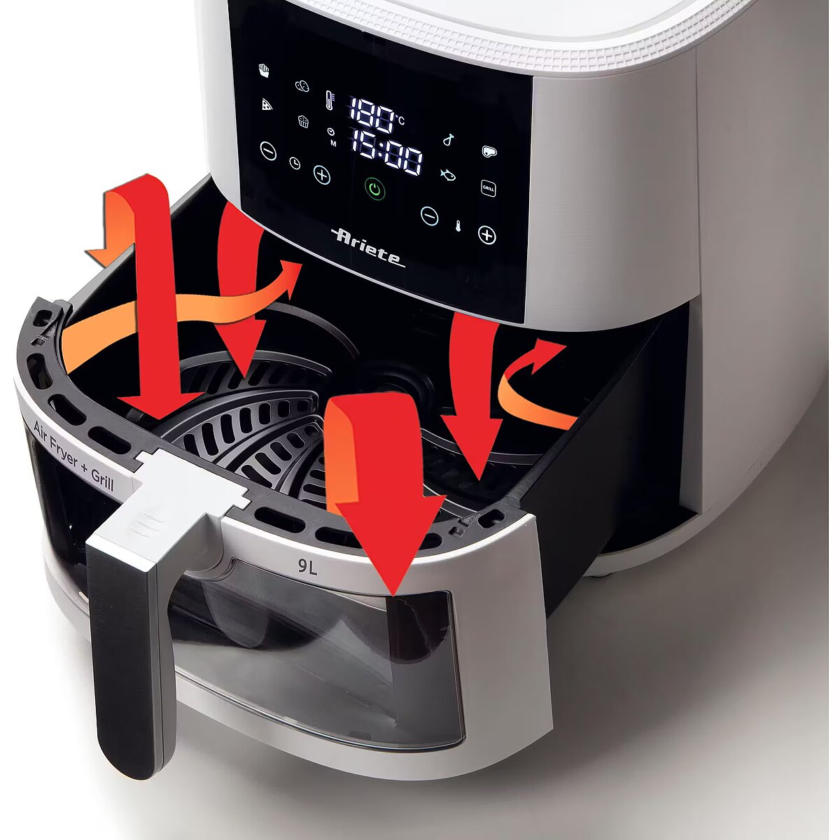 ShortSummaryDescription - Ariete 4630 Air fryer 9L, 1300W, Capacity 9L, Cooking capacity 2.5kg, 8 preset programs, Temperature of up to 200°, Transparent basket for cooking control, White, Hot air fryer, 9 L, 3.5 kg, 200 °C, Single, White