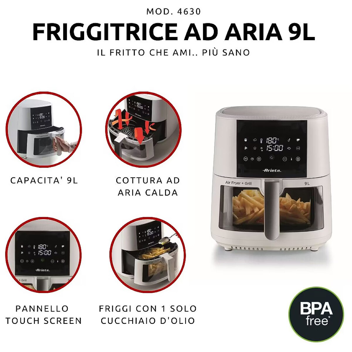 Title - Ariete 4630 Air fryer 9L, 1300W, Capacity 9L, Cooking capacity 2.5kg, 8 preset programs, Temperature of up to 200°, Transparent basket for cooking control, White