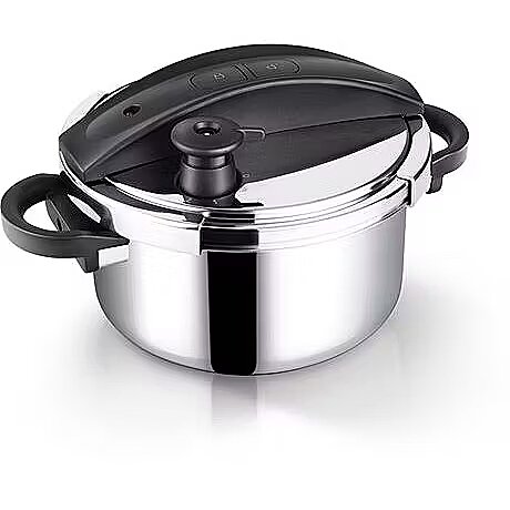 - Szybkowar wyposażony jest w manometr, zawór bezpieczeństwa, zawór bezpieczeństwa kontrolujący nadciśnienie i masywne uchwyty ułatwiające obsługę i zapobiegające oparzeniu