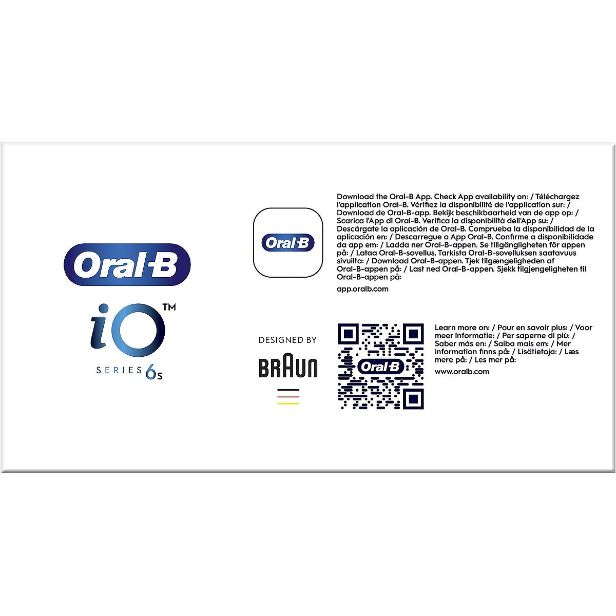 LongSummaryDescription - Oral-B iO 6. Purpose: Adult, Toothbrush type: Vibrating toothbrush, Teeth brushing modes: Daily care, Deep clean, Gum care, Sensitive, Whitening. Power source: Battery, Battery type: Built-in battery. Package type: Box. Number of handles included: 1 pc(s), Number of brush heads included: 2 pc(s)