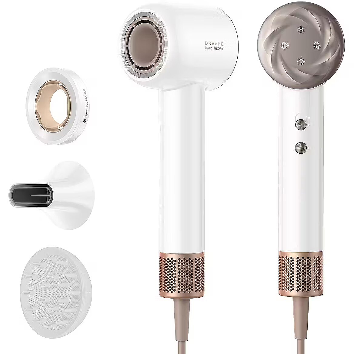Description - Hair dryer Dreame Glory Mix The Dreame Hair Glory Mix High-Speed ​​Hair Dryer is a premium high-speed hair dryer that combines power, style and hair care. Equipped with a digital motor that rotates up to 110,000 rpm, it provides fast drying without overheating. Ionic technology reduces static electricity and adds shine to hair, and multiple temperature and speed settings make it easy to adapt the drying to any hair type.Elegant design Compact dimensions Infusion perfume function Ionization function Temperature control using NTC Quick drying Light weight