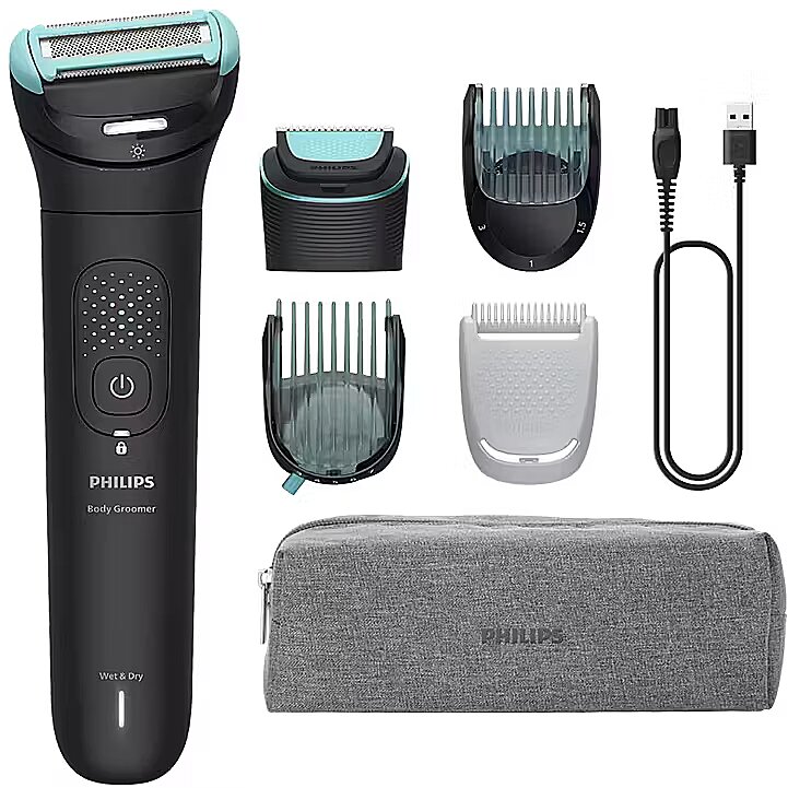 Description - Complete, versatile body and intimate grooming For a precise, skin-safe trim across the body The unique dual-head system allows you to effortlessly switch between shaving and trimming, without compromising on skin comfort. With 2D flexing head technology, the shaver adapts to your body's curves, catching even the most stubborn hairs.Close results on skinAdjustable precision combAdjustable comb (3-7 mm)Dual head trim and shave system2D flexing headTriple Protect shave systemTrimmer with rounded tipsIntimate CombOptilight functionality100% showerproofTravel pouchErgonomic gripUp to 120 minutes runtimeBattery life indicator- Quick charge option provides enough power for one trimming session