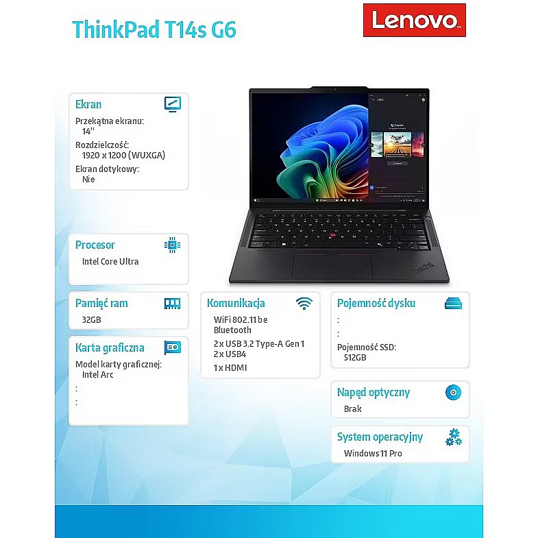 ShortSummaryDescription - Lenovo ThinkPad T14s Gen 6 (Intel) Copilot+ PC, Intel Core Ultra 5, 35.6 cm (14"), 1920 x 1200 pixels, 32 GB, 512 GB, Windows 11 Pro