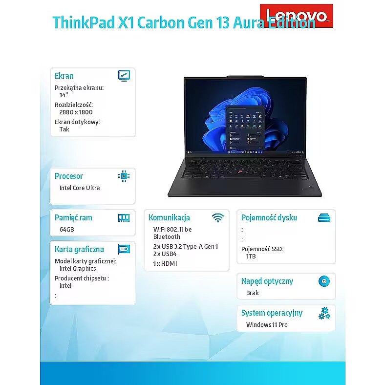 ShortSummaryDescription - Lenovo ThinkPad X1 Carbon Gen 13 Aura Edition, Intel Core Ultra 7, 35.6 cm (14"), 2880 x 1800 pixels, 64 GB, 1 TB, Windows 11 Pro