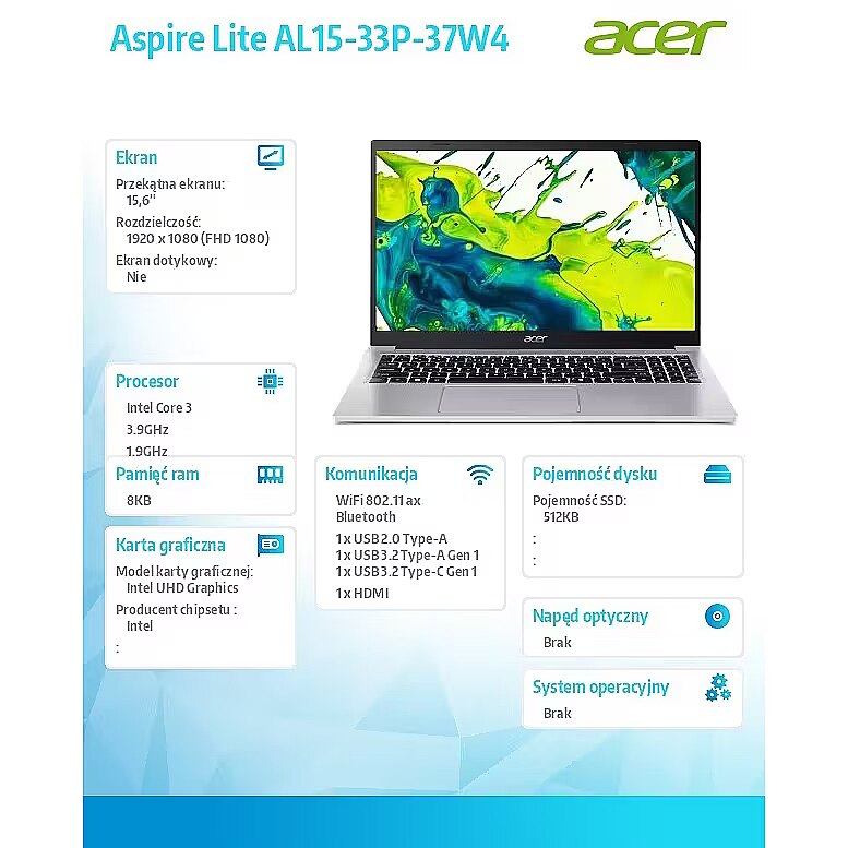 Acer Laptop Aspire Lite Core 3 N355 15,6 8GB 512GB NoOS