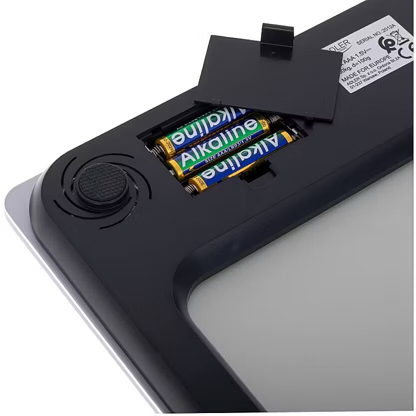 Other features > Other features - Tempered glass platform: 6mm; Low battery and overload indicator; Power: Battery 3x1.5V (AAA)