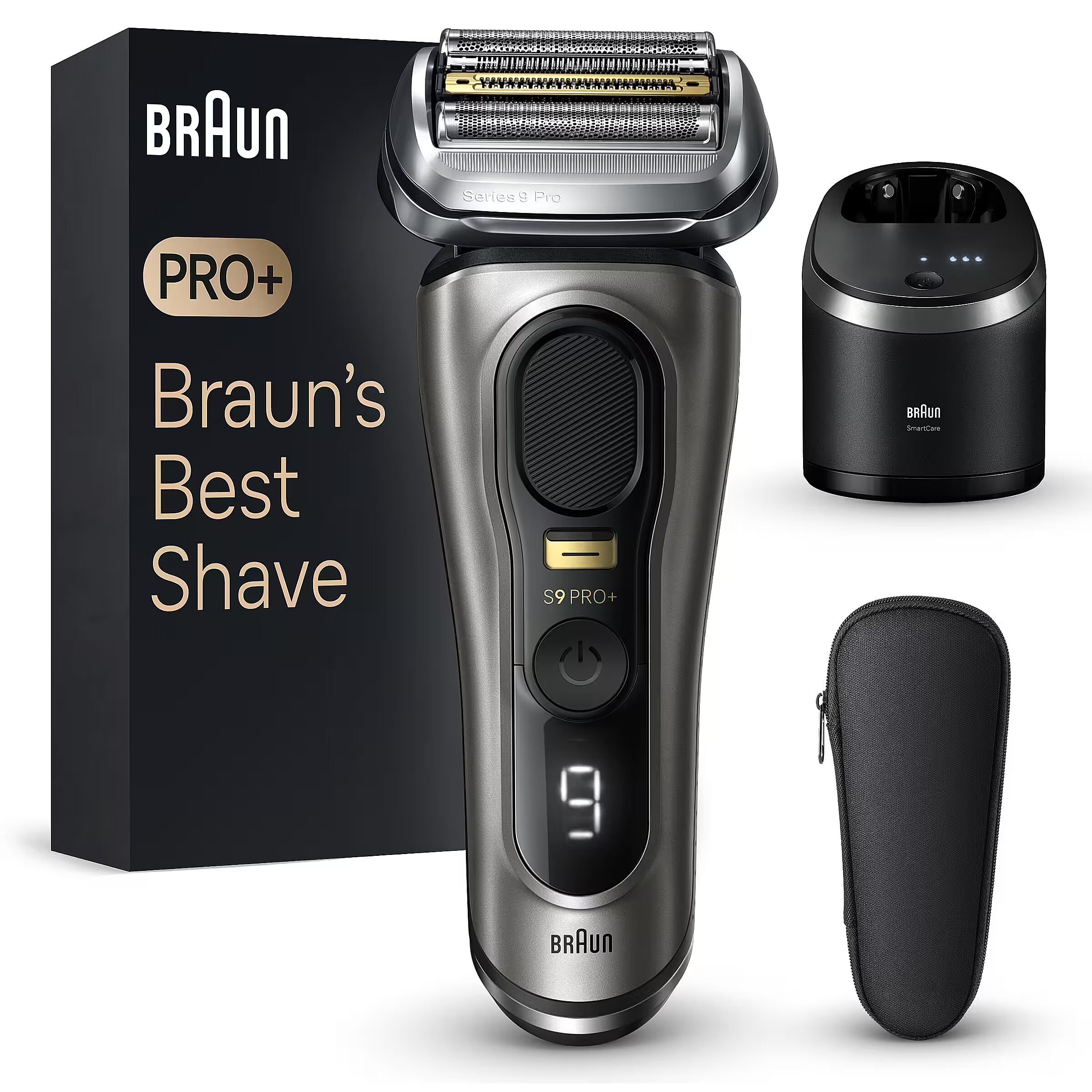 LongDesc - Braun’s best, better than ever before: Series 9 PRO+ redefines electric shaving to ensure ultimate closeness, skin comfort and precision.No matter 1, 3, or 7-day beard: 5 perfectly synchronized shaving elements deliver exceptional efficiency and skin comfort, even on the longest & trickiest hair in every stroke.Ultimate precision even on tricky hair: Built-in precision Pro Trimmer, enhanced with surgical-grade steel, gives maximum cutting efficiency even on moustache, sideburns and under nose.For a shaver like new, every day: 6-in-1 SmartCare Center cleans, dries, and charges your razor.Built to last for years: S9 PRO+ is 100% made in Germany. 100% waterproof. Powerful 60min Li-Ion battery runtime. Use wet or dry.