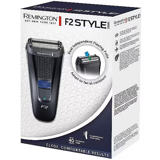 Description - GOLARKA FOLIOWA STYLE SERIES F2 Zwiększ komfort podczas golenia dzięki golarce foliowej Remington Style Series F2! Podwójne, niezależne ostrza delikatnie dopasowują się do konturów twarzy, wychwytując nawet najkrótszy zarost, a wysuwany trymer o zaokrąglonych krawędziach idealnie sprawdza się w dokładnym i precyzyjnym wykończeniu zarostu w trudno dostępnych miejscach. Podwójne, niezależne ostrza Każda twarz jest inna, dlatego golarka Remington F2 posiada niezależne, ruchome ostrza, które precyzyjnie dopasowują się do unikalnych konturów twarzy. Możesz cieszyć się dokładniejszym i wygodniejszym goleniem. Wysuwany trymer Comfort Trim Dzięki zaokrąglonej krawędzi, wysuwany trymer Comfort Trim idealnie nadaje się do precyzyjnej stylizacji. Niezależnie od tego, czy modelujesz zarost, przycinasz włoski na szyi czy docinasz swoje bokobrody, zrobisz to szybko, wygodnie i bez podrażnień skóry. Do 40 minut pracy bezprzewodowej Długa praca urządzenia bez konieczności ładowania go to bardzo duże udogodnienie. Golarka foliowa Style Series F2 zapewnia nawet do 40 minut pracy bezprzewodowej, dlatego nie musisz jej często ładować. Sprawdź, jakie to wygodne!
