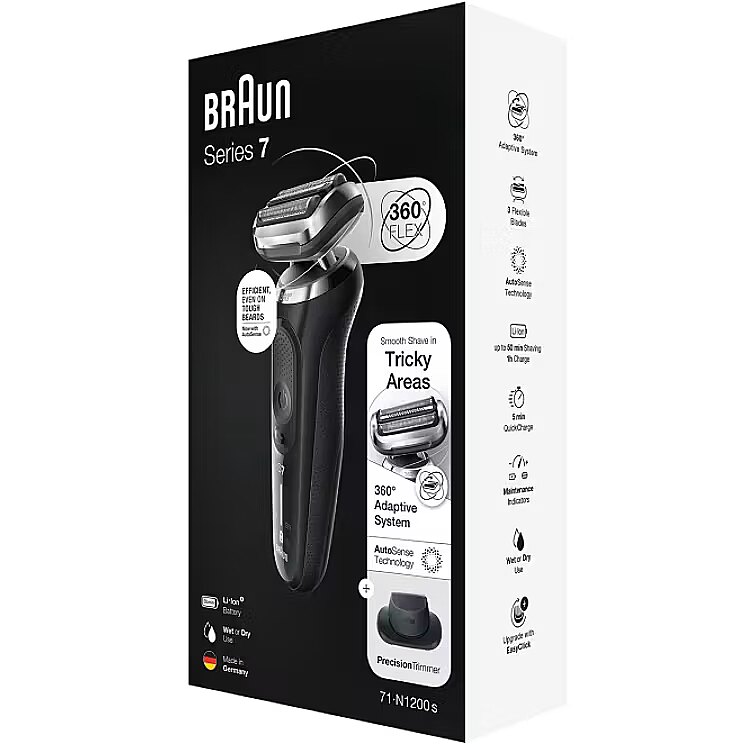 Technical_details - Type: Razor Colour: black/silver EAN: 4210201433828 Manufacturer No.: 71-N1200s Power supply: built-in rechargeable battery : Yes : 100 - 240V : Li-Ion : 50 minutes : 1 hour : 5 minutes Use: shaving, trimming Application: Wet, Dry Shaving/Cutting System: 3 flexible shaving elements Shaving head: Movable shaving head, contour adjustment : 360° flex head Attachments: 1 piece : Precision trimmer attachment Display: LED display (battery status, cleaning status, replacement indicator, travel lock status) Cleaning: Fully washable Storage: travel case Notes: Non-slip handle for safe handling Feature: AutoSense technology, Wet&Dry technology Accessories: Precision trimmer attachment, SmartPlug, travel case, cleaning brush