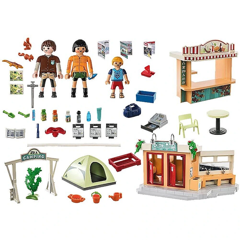Description - This set contains everything kids need for a fun vacation under the open sky. A kitchen and a sanitary area ensure comfort in everyday camping life. No sooner are the tent and camping furniture up than the PLAYMOBIL vacationers are already chatting with their campground neighbors. There's always something going on at the PLAYMOBIL campsite! The PLAYMOBIL campsite is the ideal set for little camping fans. In addition to comfortable camping furniture, the vacationers also have a clean sanitary building and a kitchen at their disposal. At the kiosk you can get some tasty snacks. A wonderful campsite to feel at home and unwind to your heart's content. The detailed camping toy includes three PLAYMOBIL figures, a sanitary building, a kiosk, table, chairs and other great extras for fun role-playing adventures. With the various PLAYMOBIL camping playsets (sold separately), children are inspired to tell their own stories.