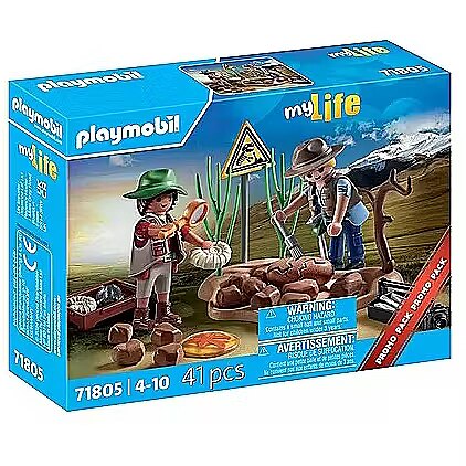 Description - The track of a T-Rex has been discovered! On her motorbike loaded with equipment, the researcher sets off looking for traces. Next to a footprint in a mud pot, she finds remains of its prey and a particularly large leaving. Includes a dinosaur knowledge card. Experience extra-large dino fun with the T-Rex from PLAYMOBIL. On her motorcycle with trailer, the researcher embarks on a quest to uncover traces of the Tyrannosaurus Rex. She succeeds and soon discovers bone fragments and a gigantic footprint. But when the original T-Rex suddenly appears before her, it's time to stay calm. The PLAYMOBIL Dinosaur World invites kids aged 4 and up to immerse themselves in exciting role-playing adventures and relive the fascination of these giant reptiles at home. Specifications: Cool PLAYMOBIL Dinosaur set featuring a PLAYMOBIL researcher, a Tyrannosaurus Rex, a motorcycle with trailer, a puddle with a footprint, a magnifying glass, camera, map, and additional research equipment. The T-Rex has movable arms, legs, and head, and an articulated jaw. Includes a knowledge card with fascinating dinosaur facts. All PLAYMOBIL Dino World sets are made of over 80% recycled and bio-based materials.