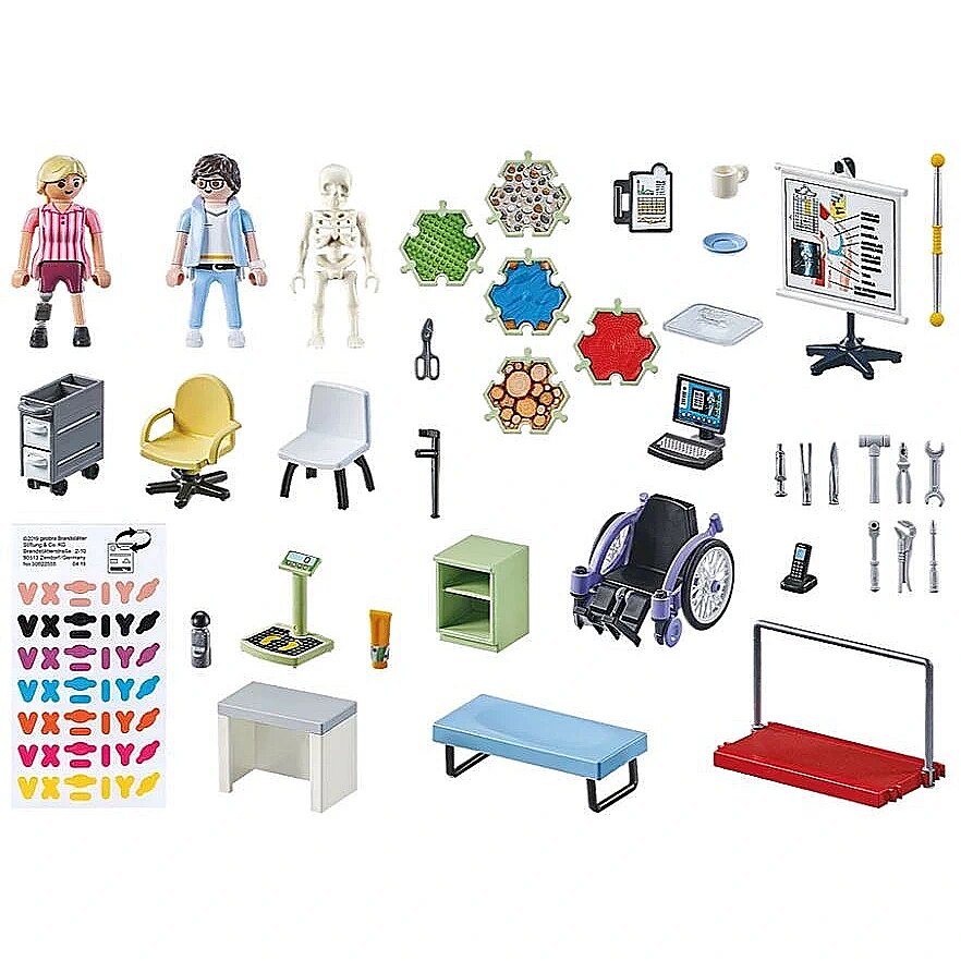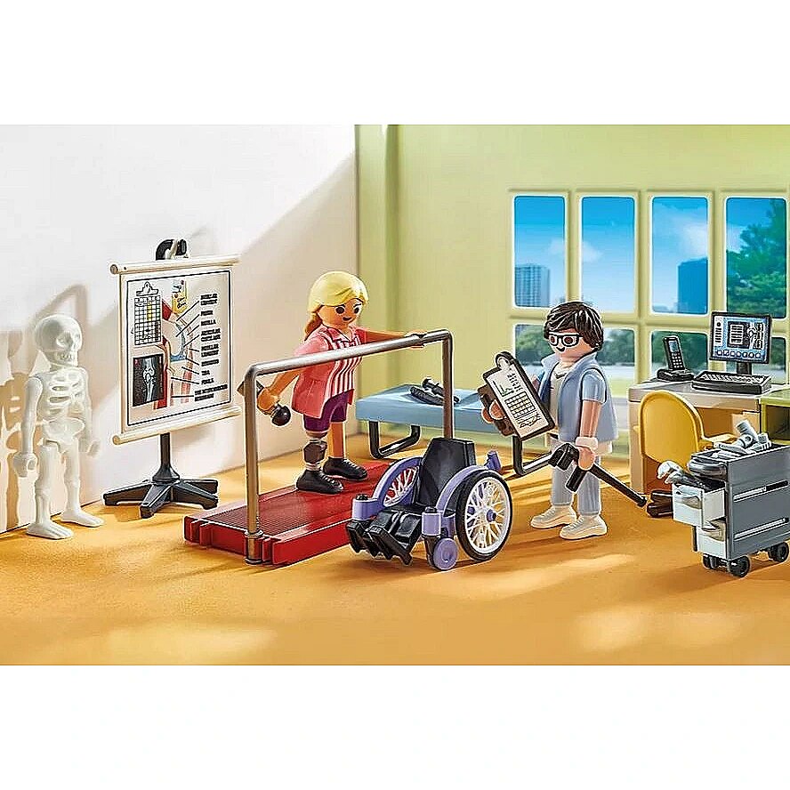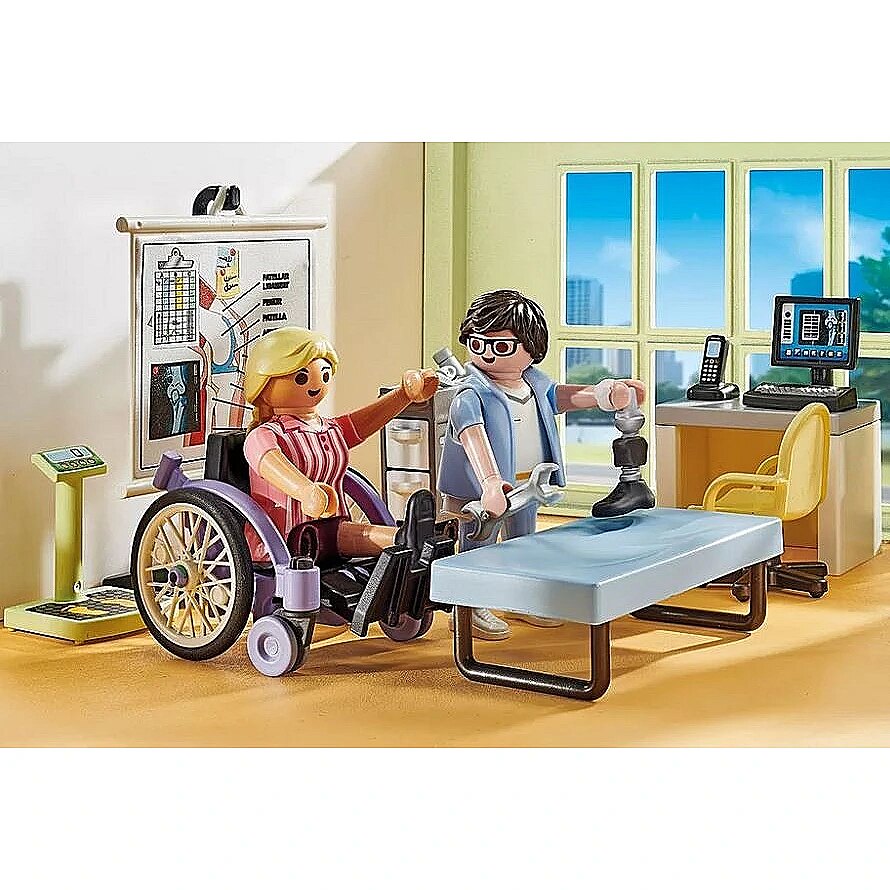 The 69-piece play set includes everything you need for role-playing in the orthopaedic ward: a treatment table, scales, various walking aids, as well as two PLAYMOBIL figures, a wheelchair and many other medical accessories. The three-piece prosthesis can be attached to the figure and removed again.